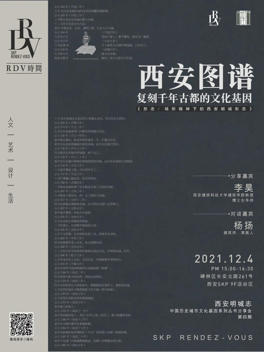 12月4日,西安建筑科技大学建筑学院教授李昊、清华大学建筑学院硕士杨扬将做客西安SKP RENDEZ-VOUS,共同分享《西安明城志——中国历史城市文化基因系列丛书》的第四辑《形志:场所精神下的西安明城形态》,带领大家一起走进西安明城区,探究这座千年古城所隐匿的文化基因。