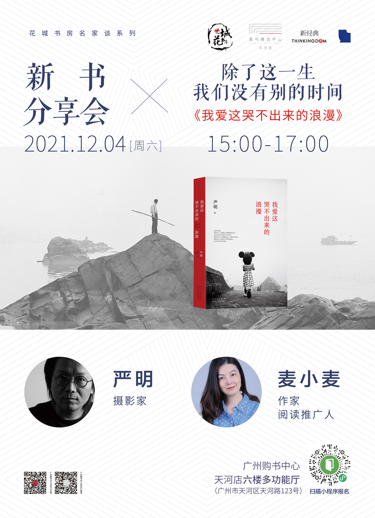 摄影家严明用艺术家敏感而关切的目光,在一座山上、一垛墙上、僧侣的衣襟上、乡野村夫沉默的脸上,找到了我们每个中国人所目睹过或经历过的故事,并在这种坚持中获得了尊严。二十年的持之以恒,辛苦的跋涉换来丰硕的成果。这些关于行路与相遇、命运与抉择、从众还是从己的人生体验,以及多年沉淀下的摄影思考,全都被他浓缩在了文字代表作《我爱这哭不出来的浪漫》一书中。12月4日,严明将携这本代表作,与作家、阅读推广人麦小麦,做客广州购书中心·天河店,聊聊取景框背后的故事,谈谈人生路上那些抉择当口鲜为人知的瞬间。