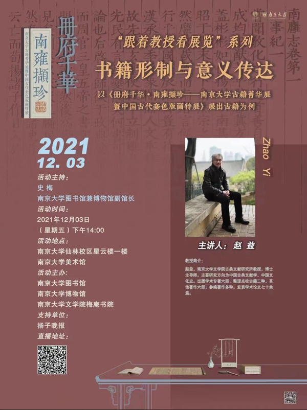 赵益老师的主要研究方向为中国古典文献学、中国文化史。本次讲座,他将以《册府千华·南雍撷珍——南京大学古籍菁华展暨中国古代套色版画特展》展出古籍为例,谈谈书籍形制与意义传达。
