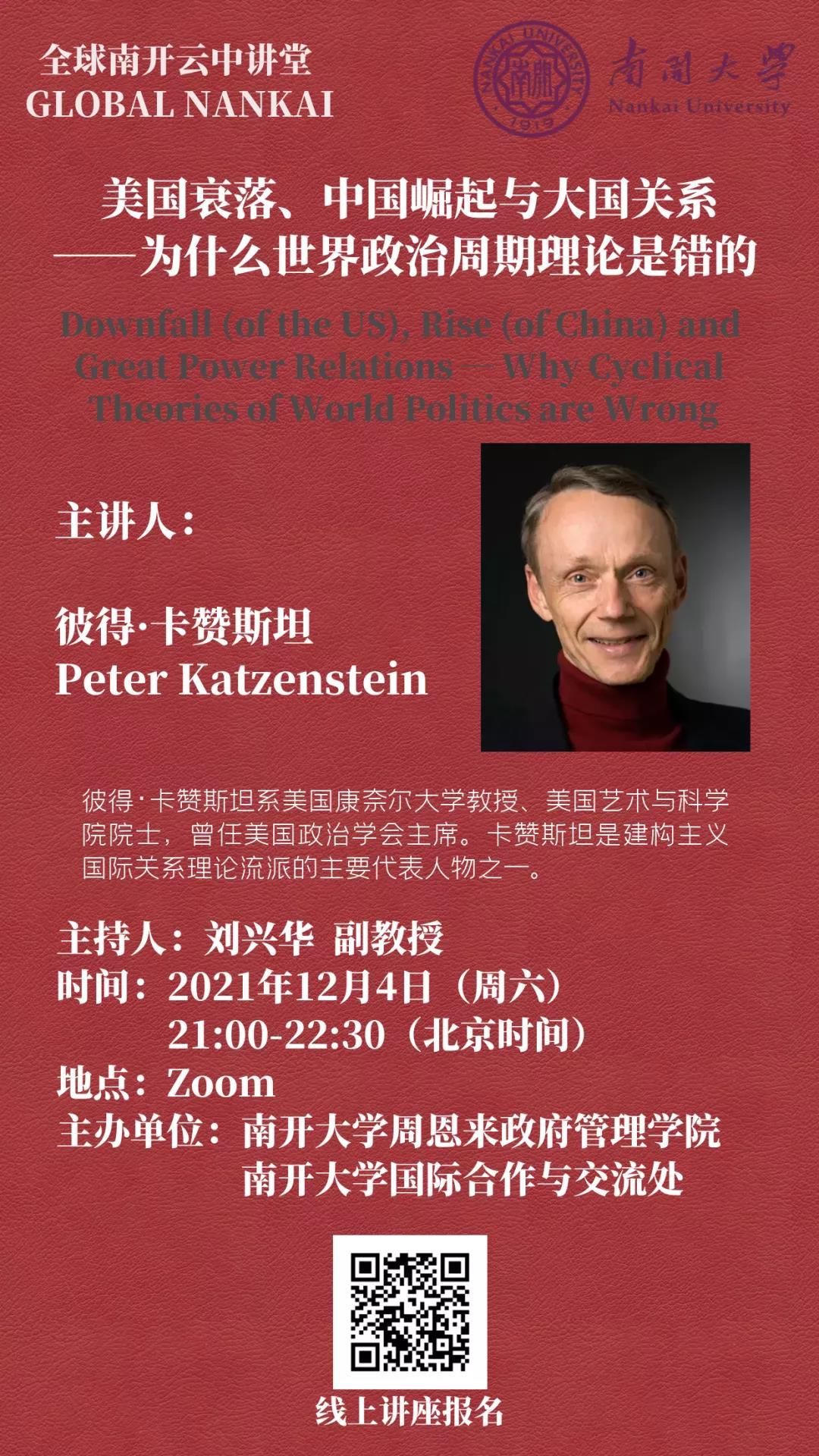 南开云中讲堂本次邀请美国康奈尔大学教授、美国艺术与科学院院士彼得·卡赞斯坦,做线上交流。他将为大家主讲中美关系,谈谈为什么世界政治周期理论是错的。