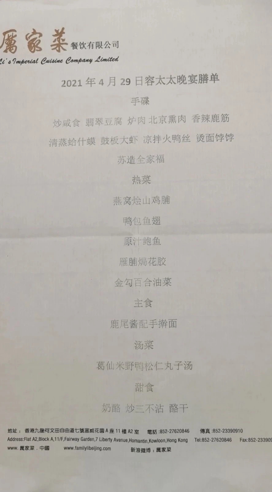 前菜如此精彩,这给热菜设了一个不小的门槛,正当我为厉先生担心时,几道热菜依次登场:燕窝烩山鸡脯,清、鲜、滑,选用山鸡的胸脯肉,应该就是为了回应燕窝的滑嫩;鸭包鱼翅,饱满、醇厚,把胶原蛋白给人带来的幸福感表达得淋漓尽致。鱼翅选用沙鱼背鳍,这部分连着鳍肉,风味十足。鱼翅就是沙鱼鳍,其主要成分就是胶原蛋白,那些针状的软骨,是钙化的胶原蛋白,虽然爽脆,但不易被人体吸收。鳍肉比较腥,质地软糯,易被人体吸收。有人喜欢鳍针,有人喜欢鳍肉,厉家菜的鱼翅连针带肉,软糯且风味十足,老鸡汤加嫩鸭肉,更给鱼翅带来鲜味,筷子夹了鱼翅,过了一会竟然粘住了;原汁鲍鱼,选用日本吉品干鲍,品质一流,连鲍鱼裙边都是溏心的,这种极品,吃少见少。厉家菜做鲍鱼,不用太多东西调味,只有老母鸡参与,基本上是鲍鱼煮鲍鱼,故曰“原汁”,与其它干鲍不同,就是鲍鱼干干净净的味道,纯粹得很;雁脯焗花胶,用雁鹅熬煮出来的浓汁焗花胶,雁鹅浓郁的野味,不仅仅带给花胶的鲜,还带来特有的香,长时间炖煮的天鹅胸脯肉,也嫩得很,吃了这道菜,终于理解了癞蛤蟆的终极追求了;青菜是选用油菜心,菜单上的“金勾”,就是泡发的虾干,给油菜带来鲜味,加上百合的甜,这种搭配,味觉甚好,视觉也佳,黄、白、绿交相辉映。听觉上,则脆得有些收敛,我想,这是因为,堂堂皇室,吃饭时咔咔作响,应被视为不雅,所以如此设计。