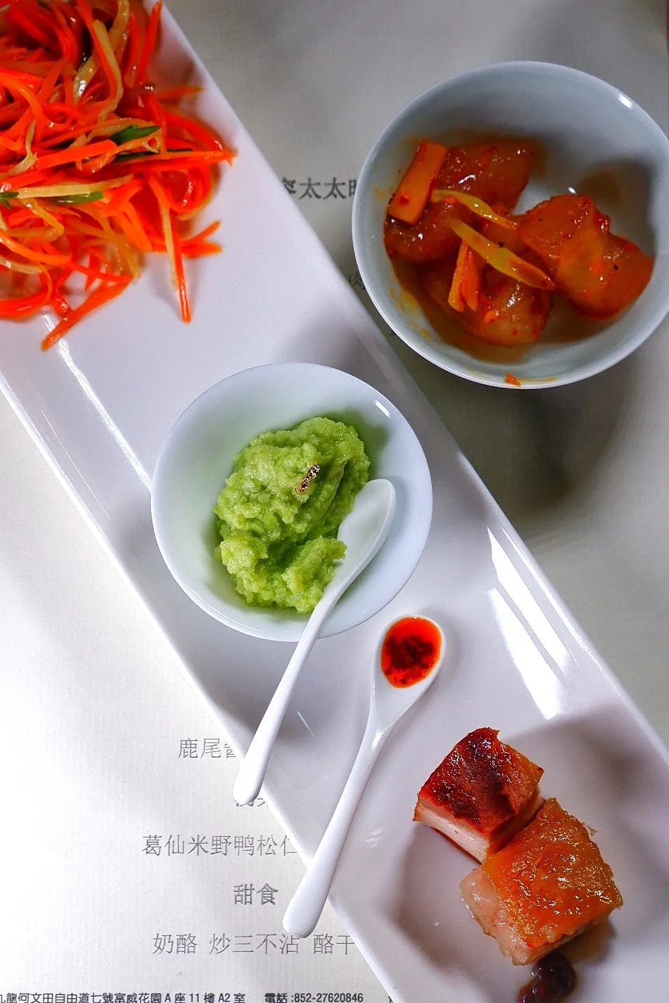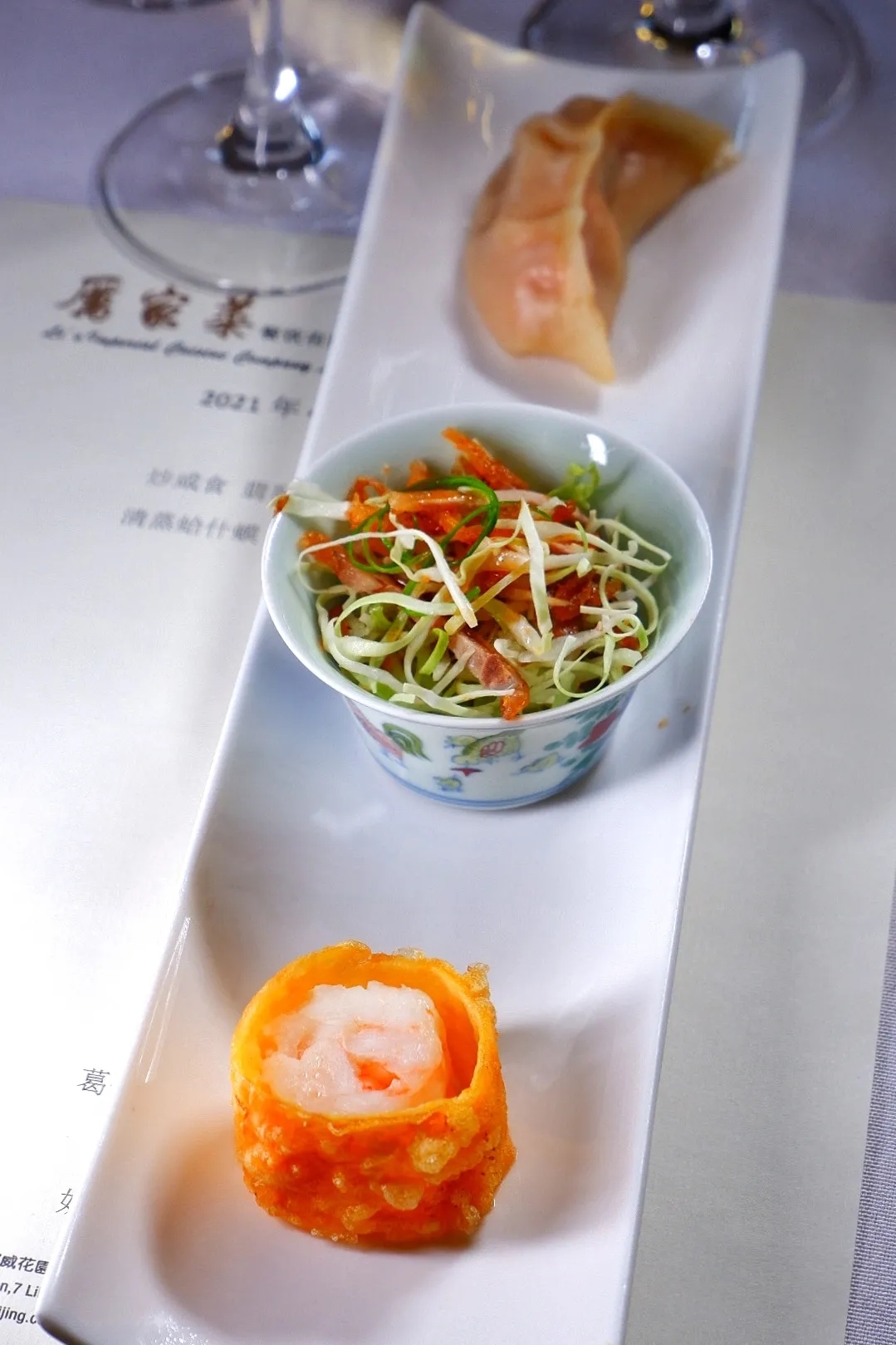 厉晓麟先生亲自下厨的这桌清宫皇家风味菜,前菜就有九道:炒咸食、翡翠豆腐、炉肉、北京熏肉、香辣鹿筋、清蒸蛤什蟆、鼓板大虾、凉拌火鸭丝、烫面饽饽,精致自不用说,故事更是丰富,味道方面,有几道菜我特别喜欢:炒咸食,看似全素,但却吃出肉味,清爽不清淡,鲜甜脆俱佳。为了让炒过的红萝卜变脆,厉家菜很是用心研究了一番:清宫是在冬天才做这道菜,炒后放凉,现在有了冰箱,炒后放冰箱降温,也就变脆,一年四季都可以吃到。这是因为食物在低温时脱水,脆就是食物脱水的一种表现;翡翠豆腐,精选毛豆去皮磨碎,用姜葱蓉煸炒后,加入由几种海鲜熬制而成的酱汁,毛豆的清香又饱含鲜味,这种表面平凡内里不凡,也许就是“低调的奢华吧”。毛豆,其实就是没完全成熟的黄豆,因豆荚长毛而得名,古称“菽”,在中国有五千多年的种植历史。嫩毛豆带有一股柔和、清新,如同豌豆般的风味,质地松脆,豆皮含有单宁,所以有一点点苦涩,把毛豆去皮,就是去除苦涩,还增加了柔嫩口感。豆腐也是由黄豆做成,这道菜名为“翡翠豆腐”,还真有豆腐般的质地和味道,当然了,风味方面更胜一筹,各种海鲜萃取的酱汁,富含谷氨酸和核苷酸,给毛豆带来了鲜味,而且不见踪影,绝了!