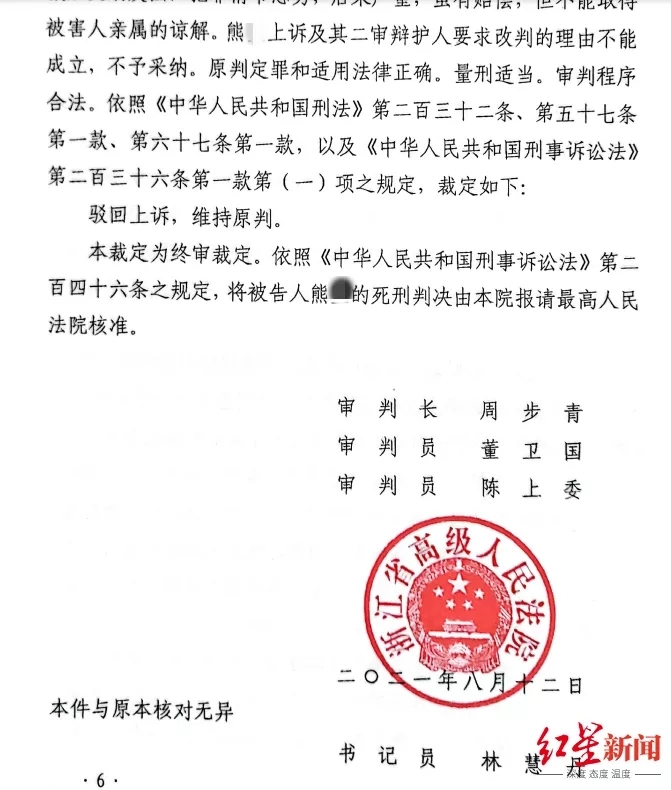 红星新闻从熊某家属处获悉,熊某在浙江省金华市中级人民法院一审时被判死刑,随后二审也维持原判。目前正处于复核阶段。