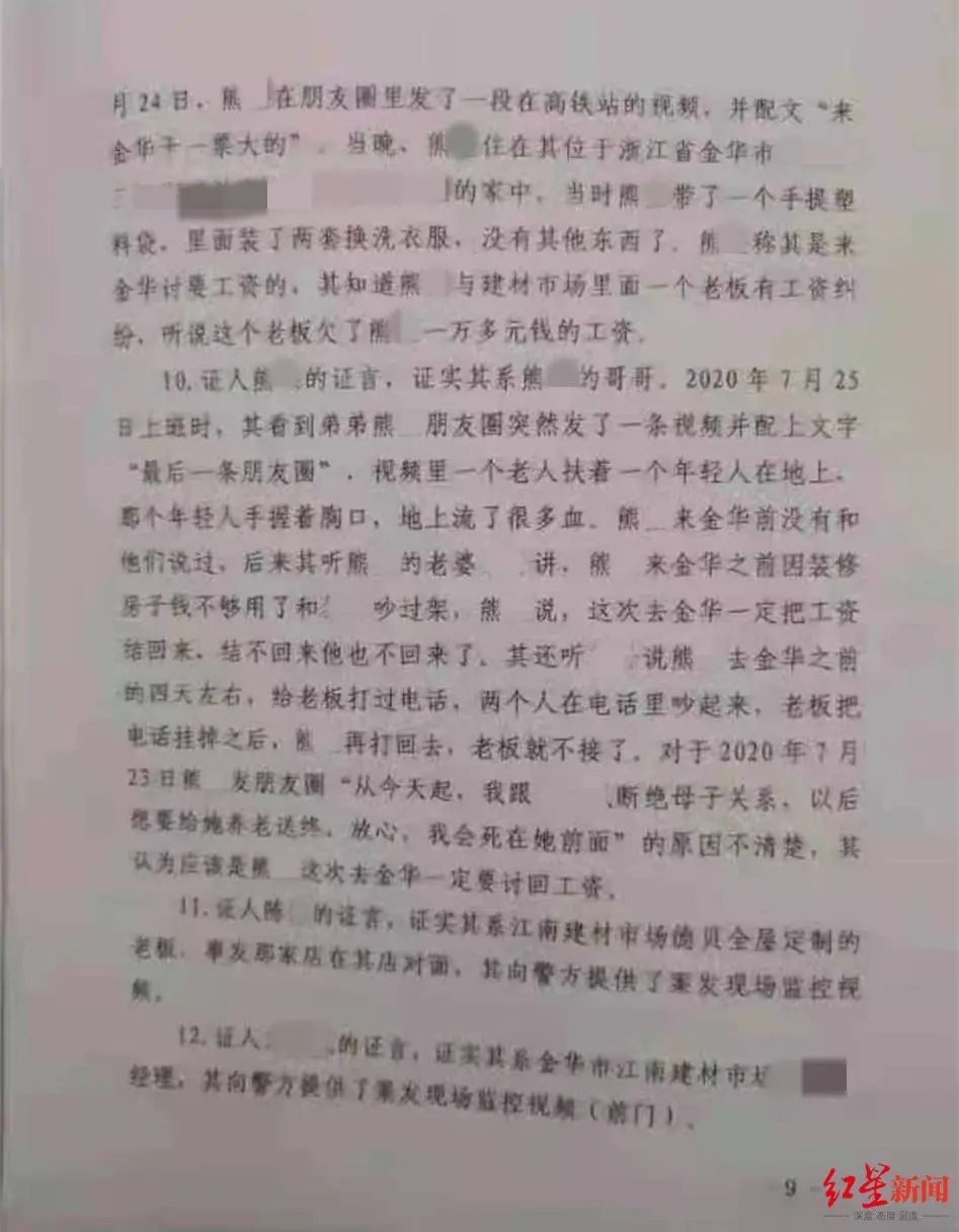 7月24日早上,熊某还到新房沟通了头天订的门槛石,回家时还买了菜,帮忙抱一岁多的孩子。熊某告诉妻子,他订了下午3点多的票去金华讨工资,并承诺要到了工资玩两天就回,要不到就去自杀。