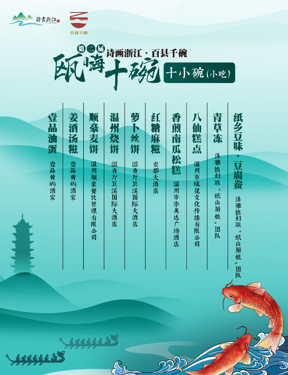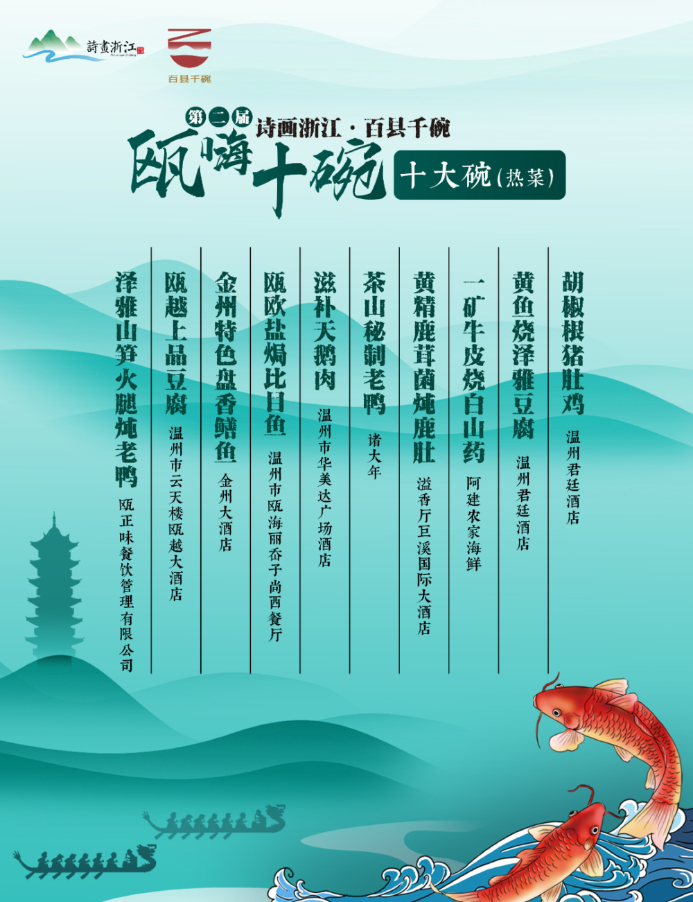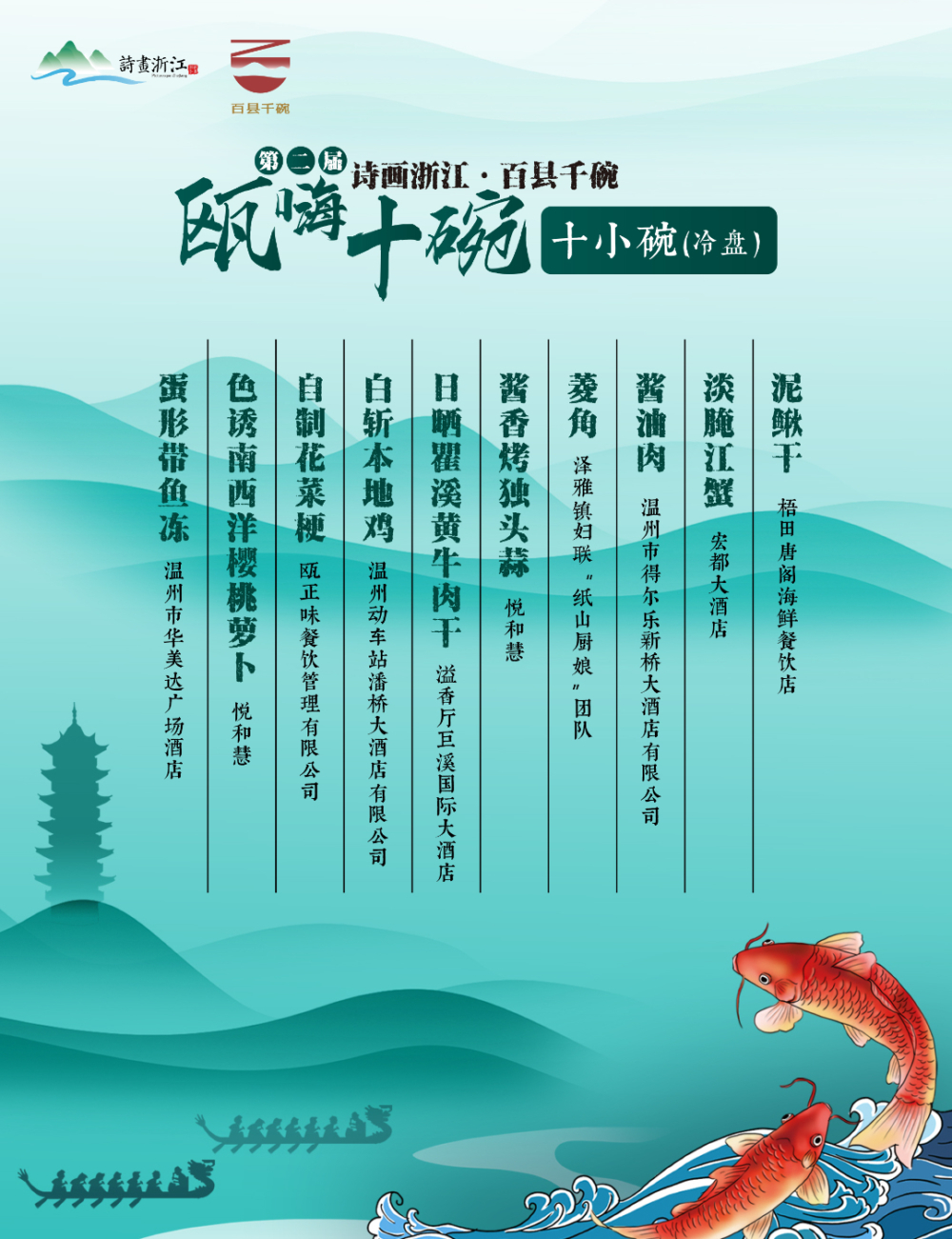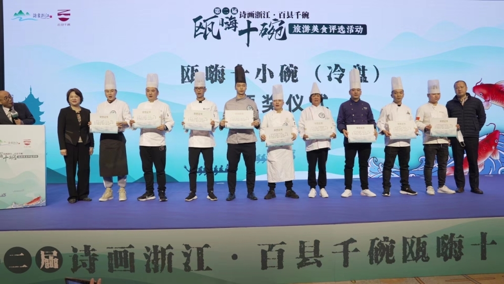 其中,泽雅山笋火腿炖老鸭、瓯越上品豆腐、胡椒根猪肚鸡等参赛作品脱颖而出,入选“瓯海十大旅游菜品”瓯嗨十大碗;蛋形带鱼冻、泥鳅干、酱油肉等入选“瓯海十大旅游冷盘”瓯嗨十小碗;壹品油蛋、青草冻、姜酒汤糍等作品入选“瓯海十大旅游小吃”瓯嗨十小碗。