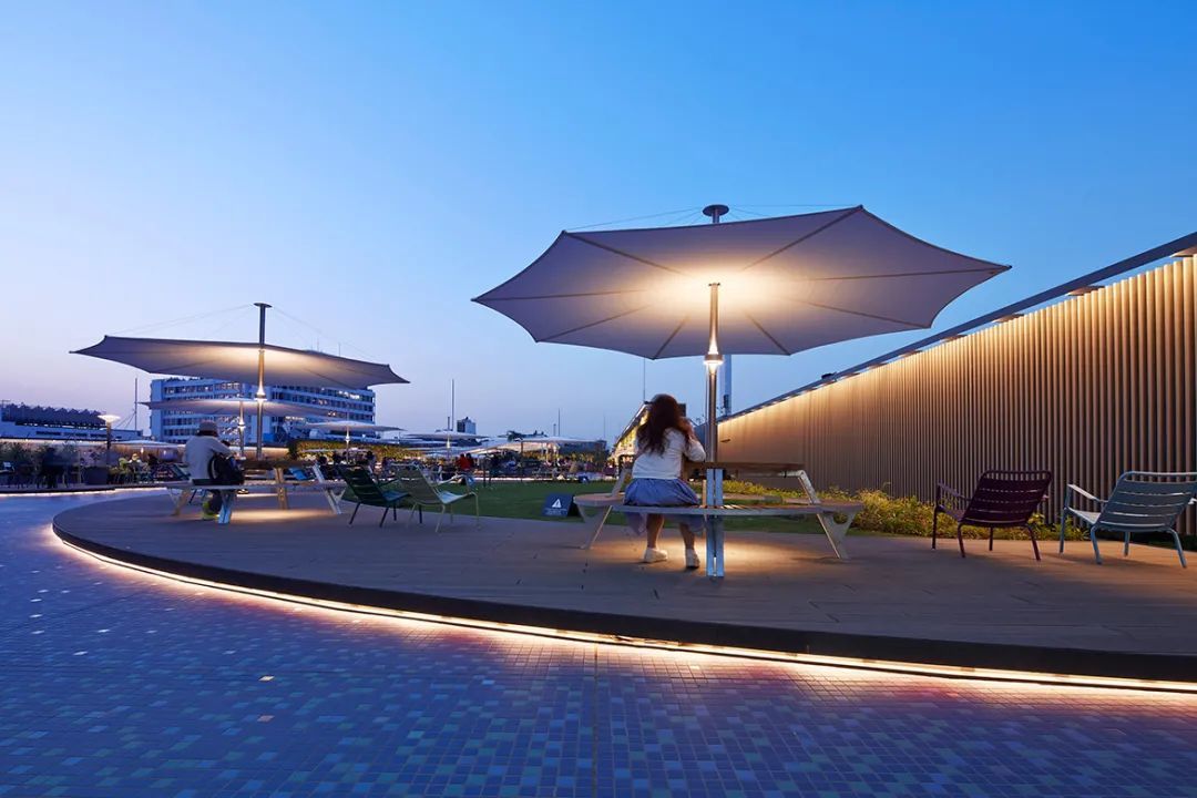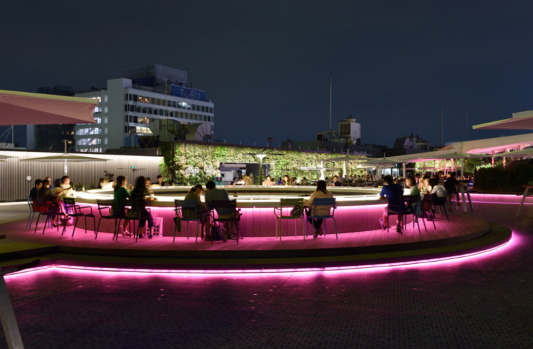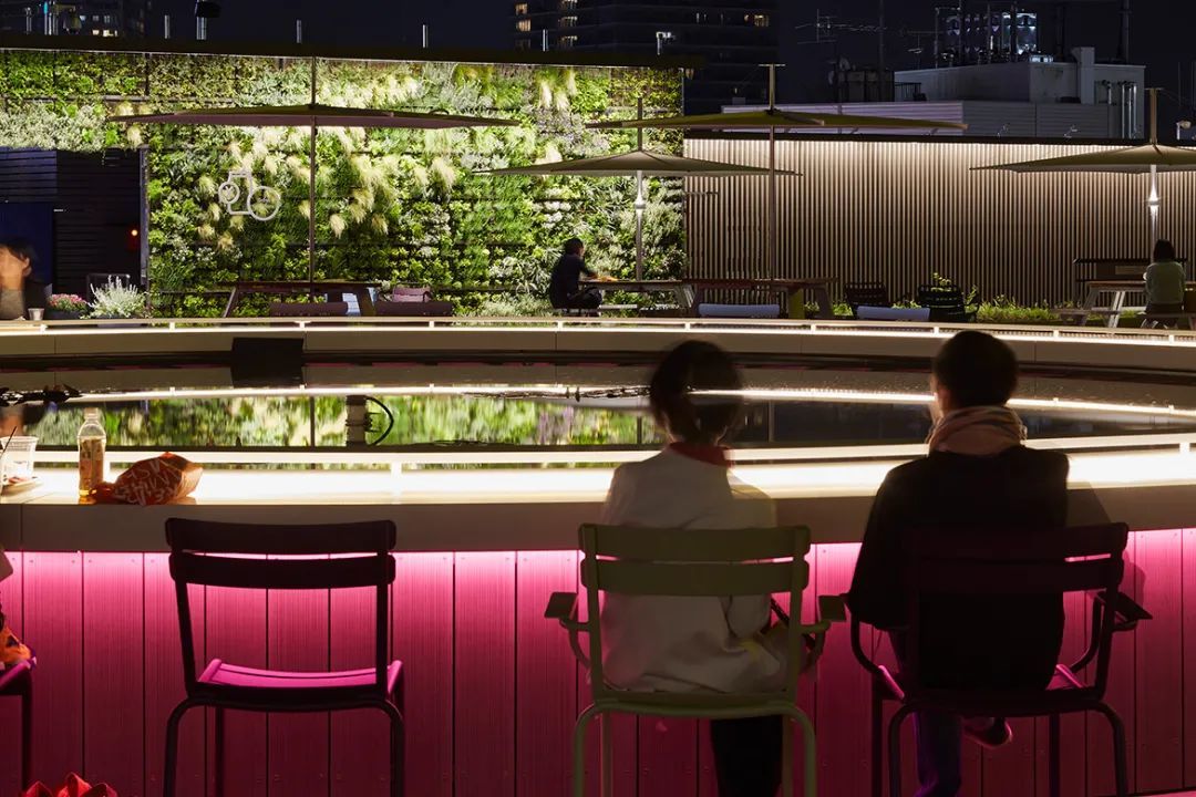 设计以印象派大师莫奈的风景画为创作原型,将屋顶整体作为画作中的水面,设计了蓝色马赛克瓷砖铺装。同时,将漂浮在水面上的莲叶作为意向设计圆形平台,创造出屋顶上的停留空间。平台上放置遮阳伞和圆形家具,不同的圆形元素相互交叠,为原本平坦的场地营造出起伏的空间感。圆形平台底部则通过间接照明呈现出浮在水面上的效果,从黄昏时分到夜幕降临,灯光色彩随时间推移逐渐变幻,与遮阳伞的照明共同演绎出夜晚的景色。此外,屋顶上所有墙体采用墙面绿化,引导视线垂直向上延伸,形成仿佛将天空剪切下来的象征性设计。在屋顶这一张画布上,人类与自然共同描绘着壮丽的风景画。屋顶上提供的多彩多样的美食、节事、活动,以及随季节变化的自然花草、随时间推移的光影变幻,这些一直处于变化之中的风景给予来访者快乐愉悦的空间体验,使空中庭园成为池袋地区的新地标。
