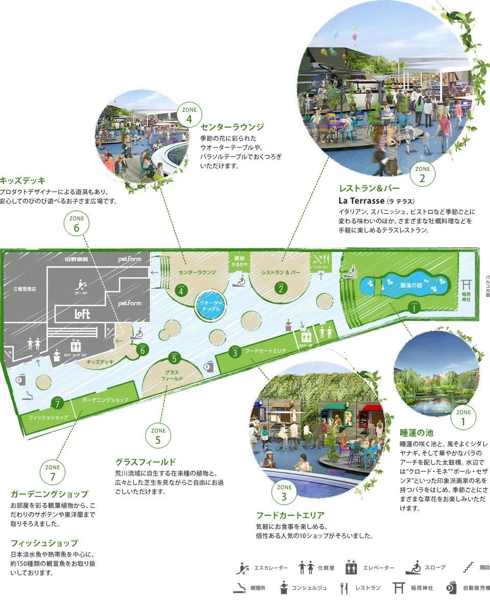 2004年6月的《都市公园法》的修正法案中,创设了“立体都市公园制度”,旨在促进商业用地中绿地空间的确保,使立体土地利用成为可能。经过多年酝酿发酵这样的理念也开始深入人心。适逢奥运会原定今年在日本开幕,很多商业以此为契机对旗下店铺进行升级改造和商业品牌的塑造,由此进入了公园式商业的爆发期。除此之外,还有诸如浅草“水町”、立川green springs、南町田Grandberry Park田园商业综合体等一批公园型商业设施,可以说成为了这一时段东京首都圈商业的一大特色。