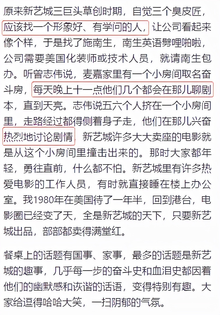 林青霞在专栏中分享了此次聚会,分享了“新艺城三巨头”(麦嘉、石天和黄百鸣)草创初期的故事。