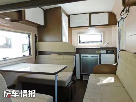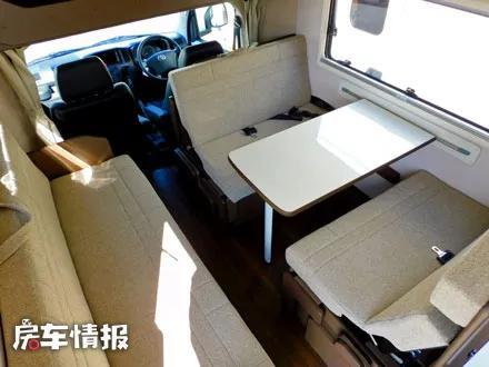 整车采用了一个后上门的设计,所以车内的布局与日本主流后上门的房车内部布局几乎相同,配色方面则抛弃了以往的原木色,改为了比较有质感的咖色和白色,提升了整体的装修风格。