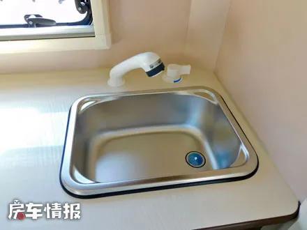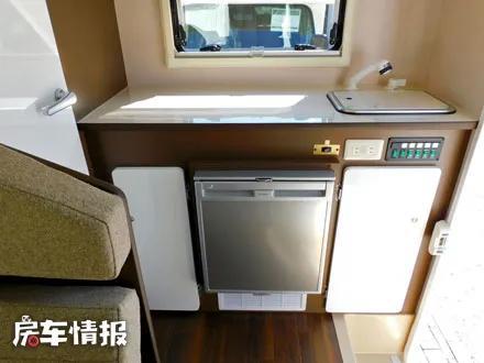 后上门的设计对应的则是后置厨房区的设计,车厢尾部的厨房操作台面积还是比较宽敞的,上方带有盖板的水槽以及抽拉式的水龙头,旁边的空置区域既可以后期放置卡式炉或者便携式电磁炉,也可以用来备菜,下方则是一台65L的单开门冰箱,内部也有冷冻空间,可以满足日常分类存储食材的需求。