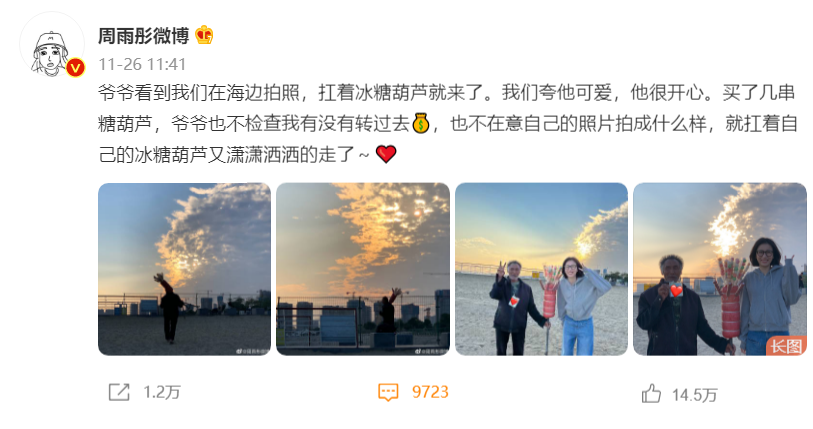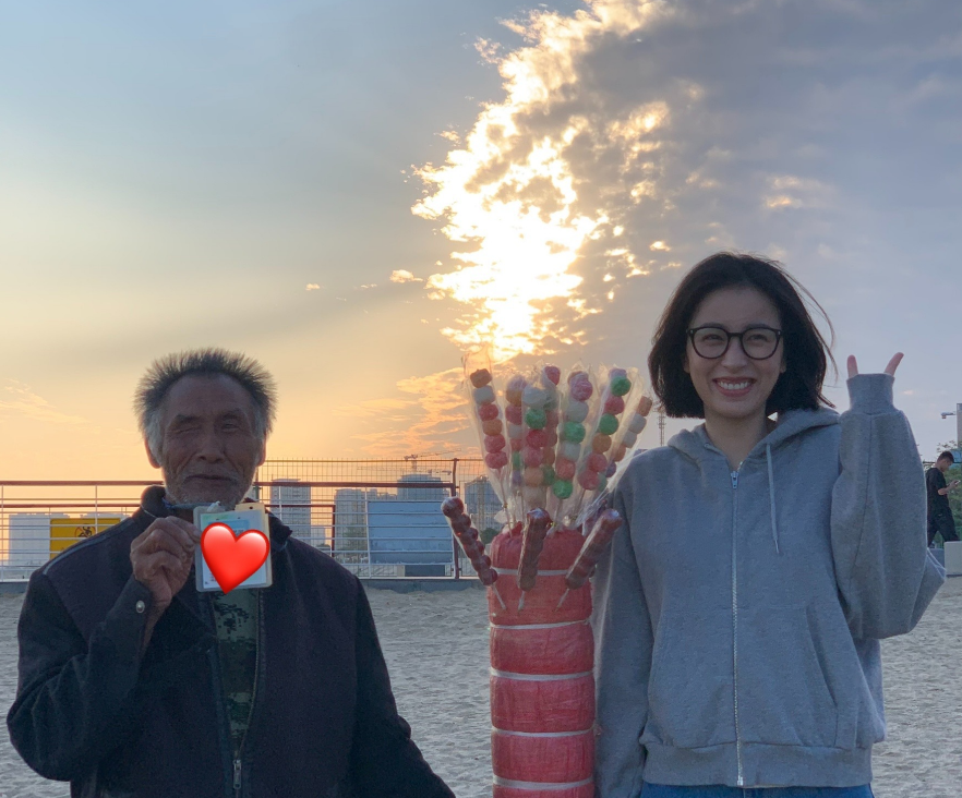 在夕阳下,周雨彤热情地和卖冰糖葫芦的老爷爷一同合影。而她就戴着黑框眼镜,头发被风吹得有些乱,身上穿着灰色开衫卫衣,对着镜头笑着比耶。
