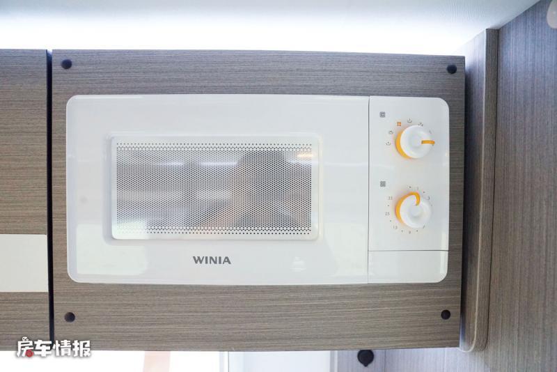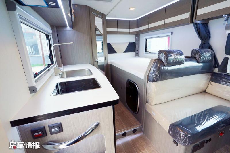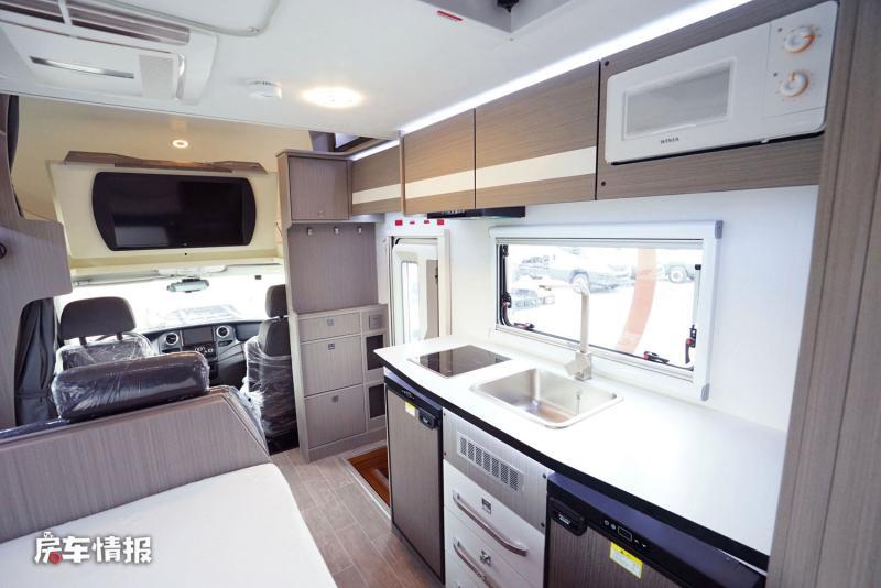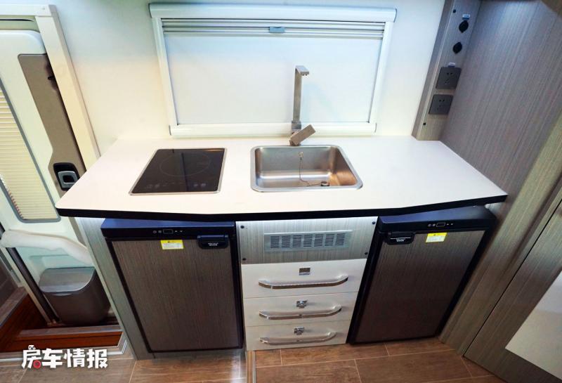 厨房区位于乘客门后方,整体的尺寸还是比较宽敞的,台面中间为不锈钢水槽,左侧为电磁炉,右侧则是可以备菜的区域,下方左右一边一台76L冰箱。顶部还配置了一台微波炉,方便平时使用。
