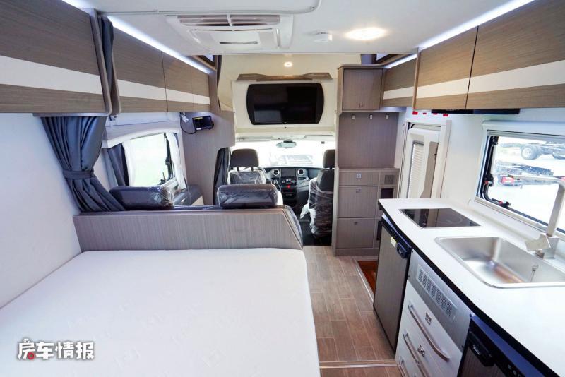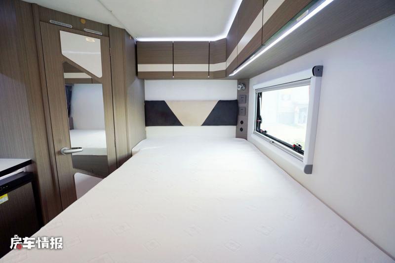 除此之外,在前方驾驶室上方的额头区域内还标配了一张双人床,床板下方也提供了一台32寸的液晶电视,可以提供娱乐项目。