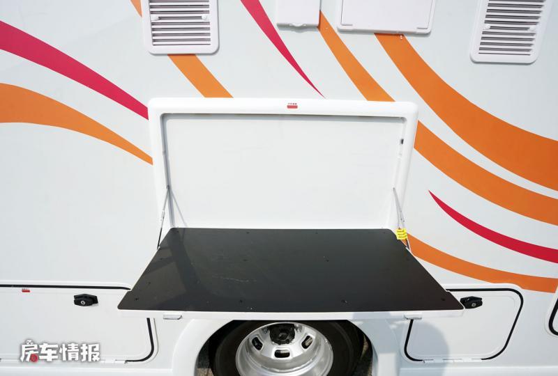 车身外部除去采用了全新的拉花设计,还加入了比较齐全的生活设施,包括手动遮阳棚、外置翻板、抽拉式灶台、外置淋浴花洒、行李舱以及水电接驳口,满足日常的生活需求。