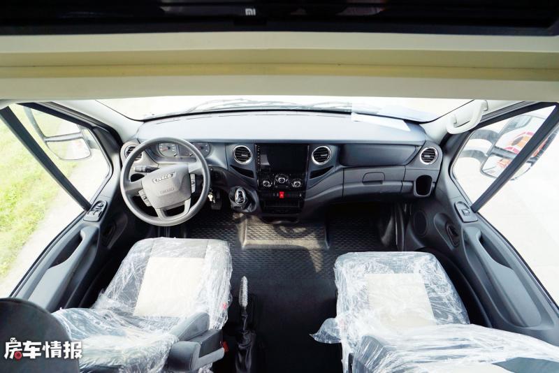 驾驶室内并没有进行太多的改动,还是使用了进口依维柯比较商务的风格,同时配置了多功能的方向盘以及中控彩色显示大屏,方便驾驶员的后期观察与操控。