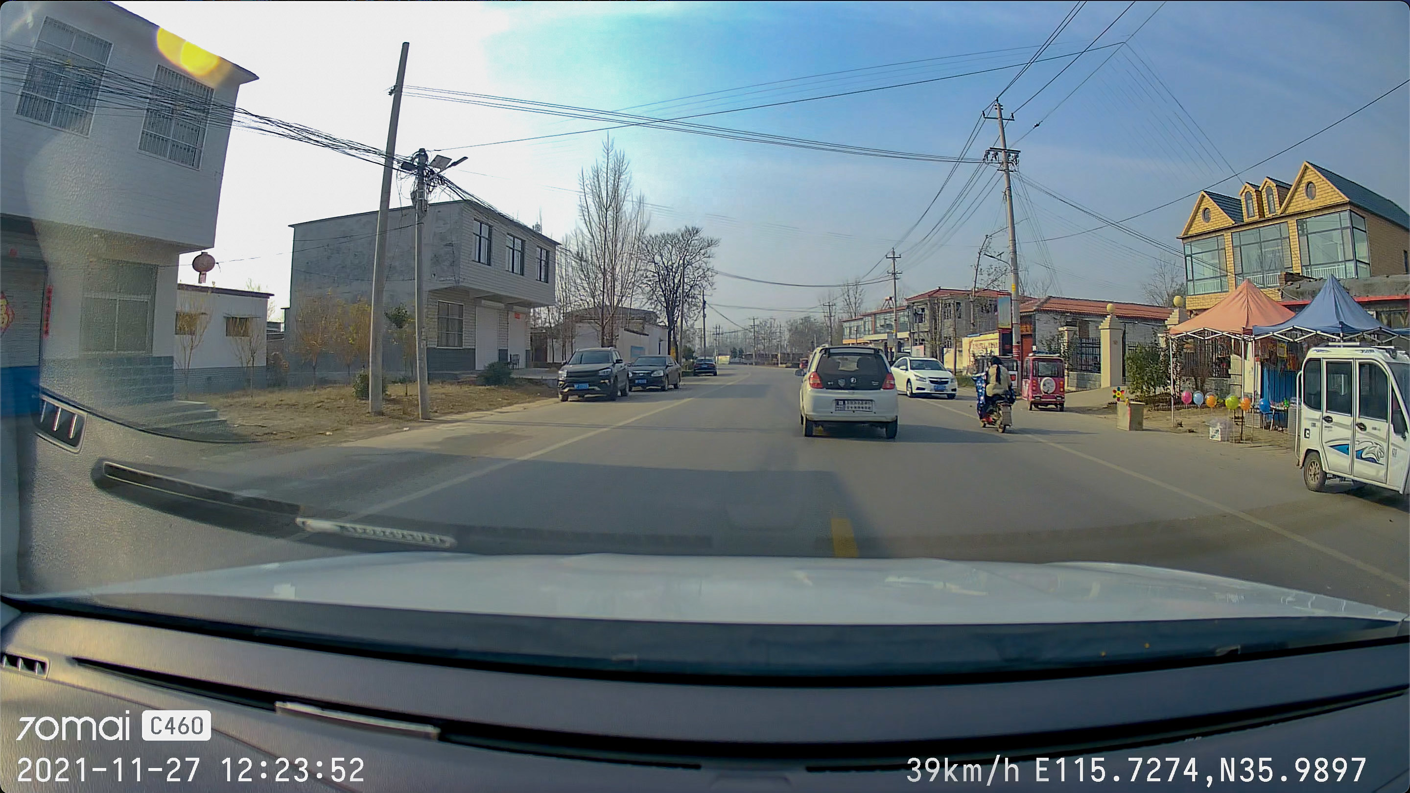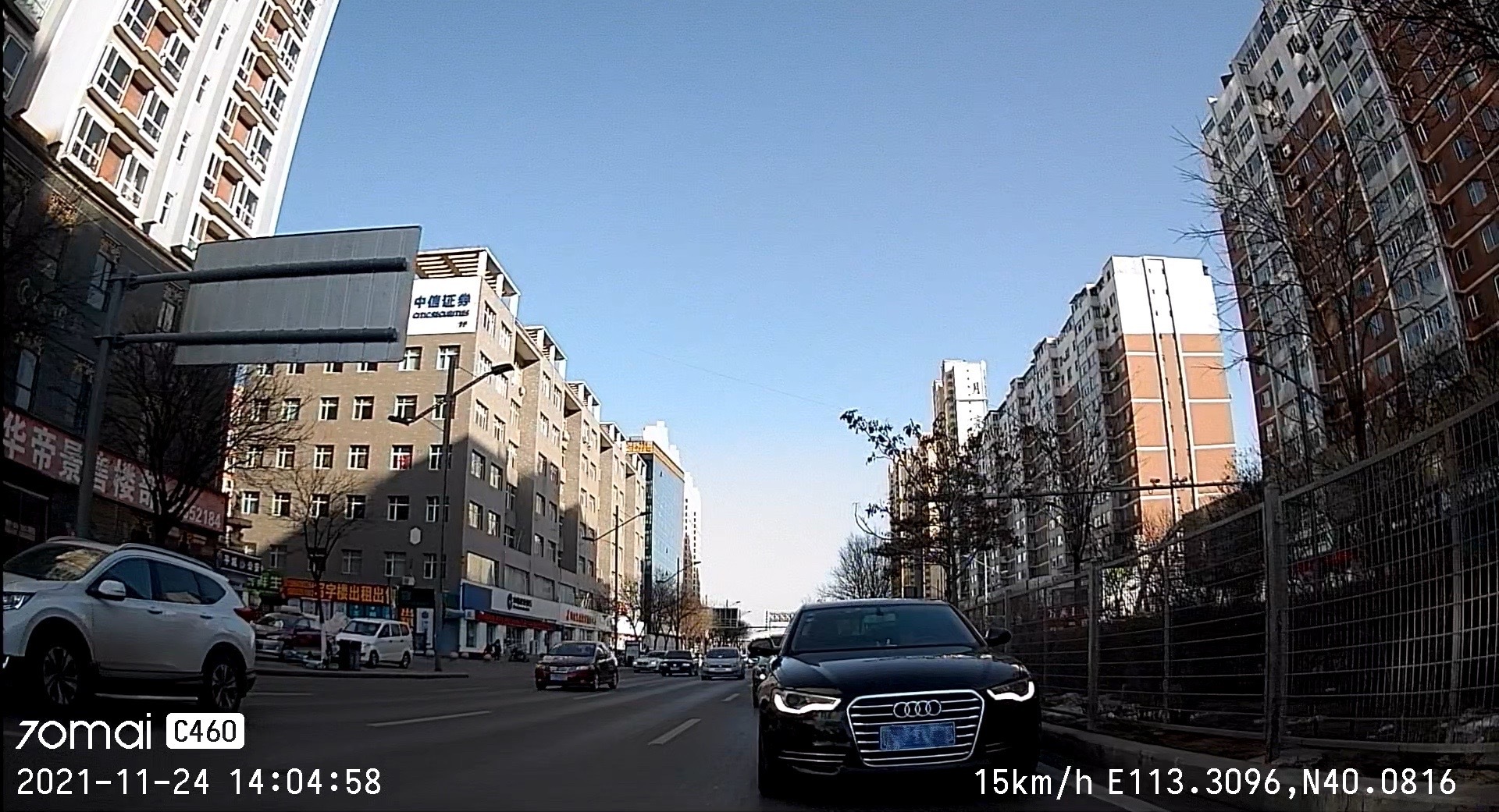 通过记录仪的录制画面截图,我们可以看到,星曜C460 150°的录制视角可以覆盖多条车道,容纳更多画面元素,监控更多情况,并且画面的畸变控制非常好。