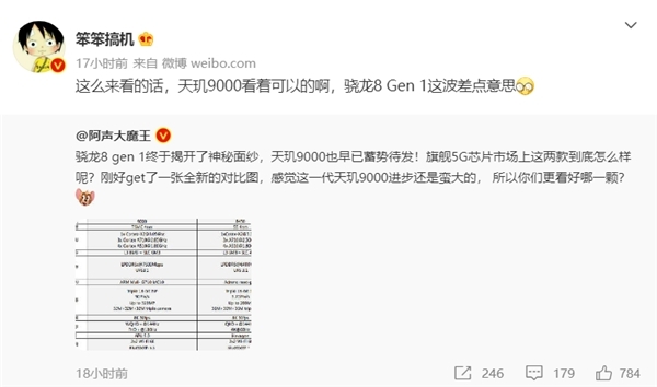 对于两款旗舰处理器的表现,有数码大V以对比图的形式做了展现,哪边进步更大一目了然。