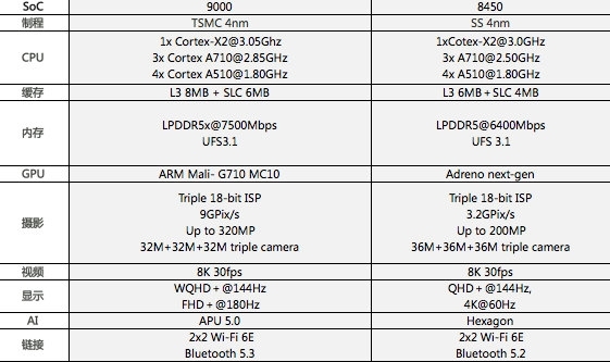 两者无疑是明年旗舰市场最炙手可热的手机芯片,以现在的账面参数来看,天玑9000稍占上风,