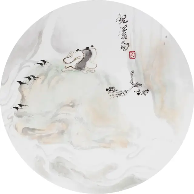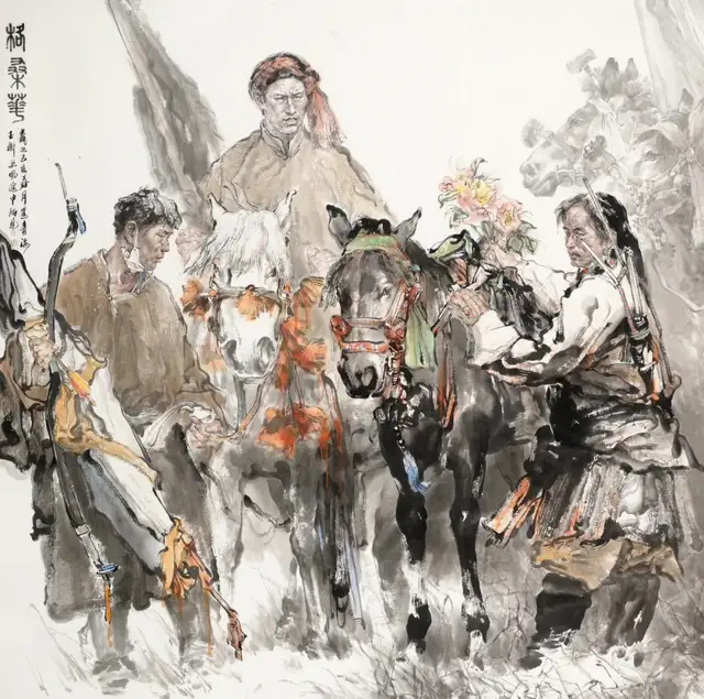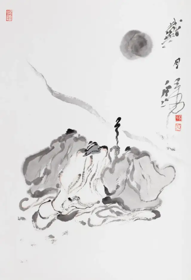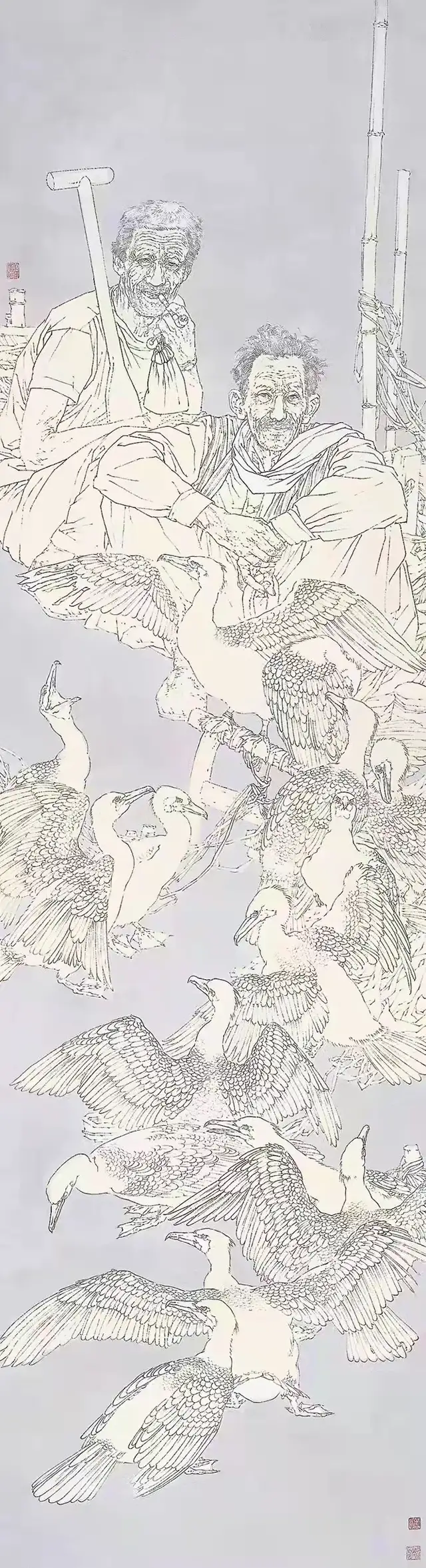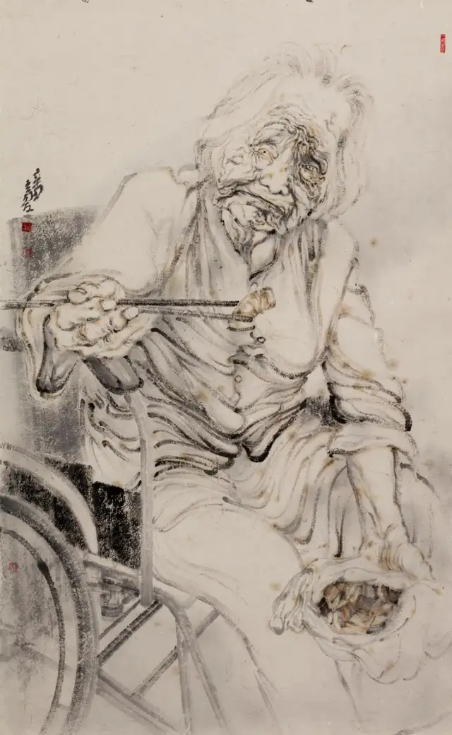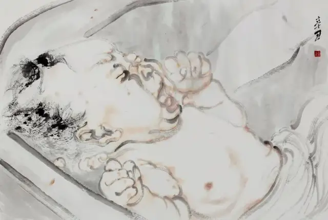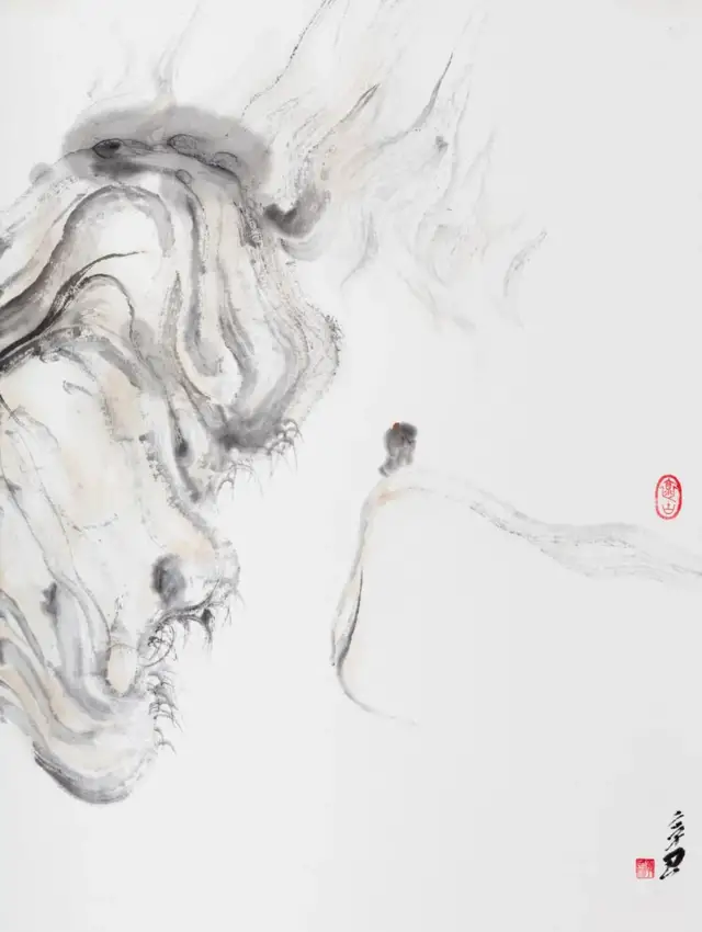亚光的作品中常见老者与孩童,一种闲逸常以寥寥数笔成画,轻松简静。特别之处在于他勾染并举,点皴并下,生机勃发,笔墨闲雅,直面自然之美。在他的画纸上寄情于人,以人写出内心之天然,显现出某种灵性的怏然。亚光的笔墨恣肆脱俗,色墨氤氲,富贵与野逸兼备,别开生面,用笔言简意赅、意蕴婉约。
