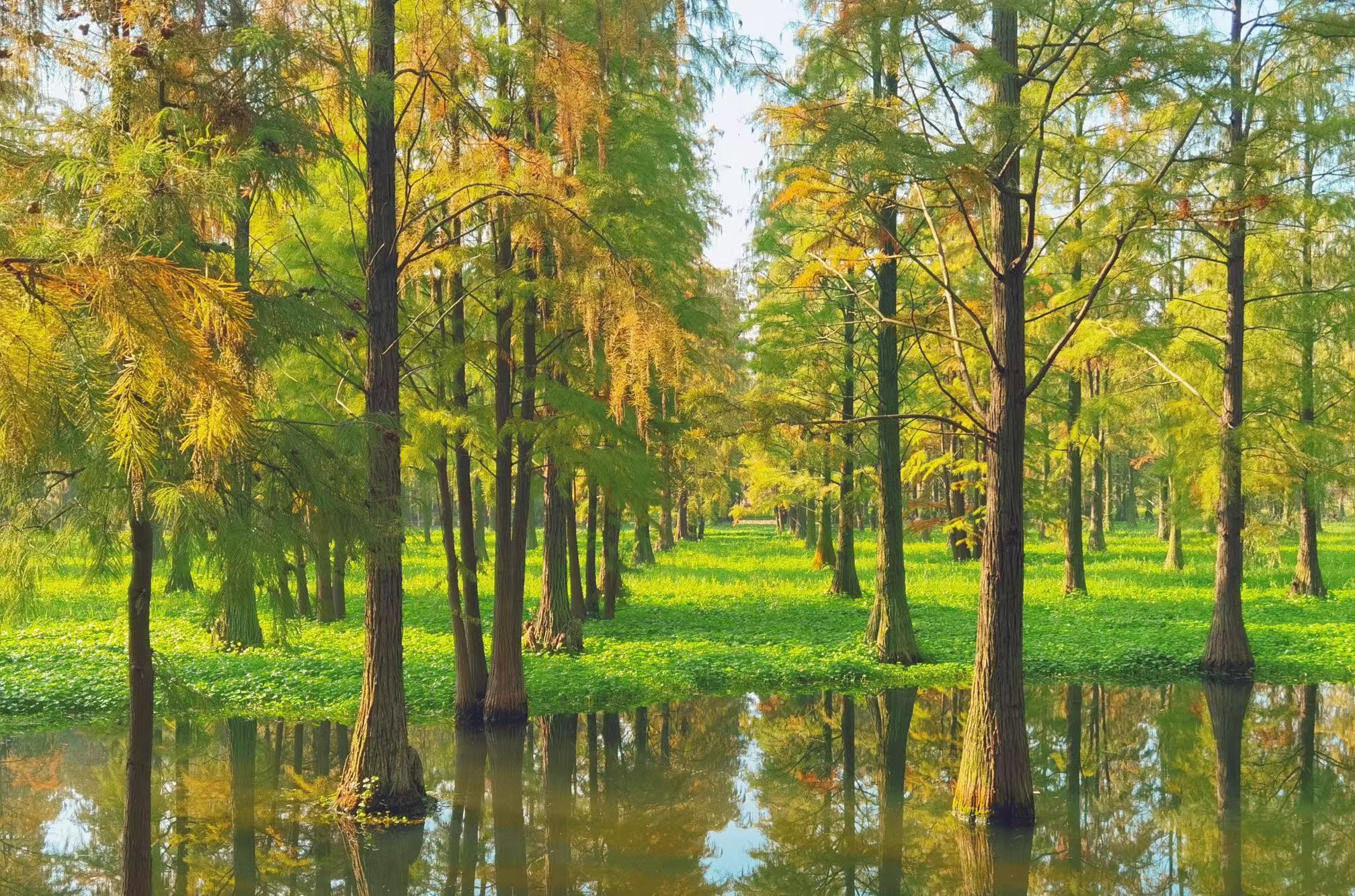 位于金泽镇的青西郊野公园是一座以湿地为特色的郊野公园,园内“湖、滩、荡、岛”纵横交错,湿地、湖泊、河流和森林一同形成了多样的生态系统。而园里最大的亮点,当属这片面积近百亩的水上森林——数千棵杉树生长在水中,这也是申城独此一家的奇特景观。