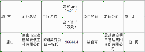 乐居买房讯 12月2日,乐居唐山获悉唐山32个工程列入2021年第二批河北省安全文明标准化工地创建计划,其中御湖美苑项目一标段在列,承建企业为唐山市仝泰建筑安装工程有限公司。