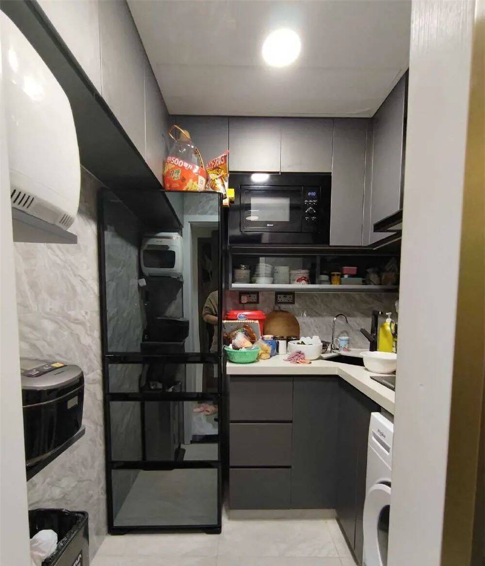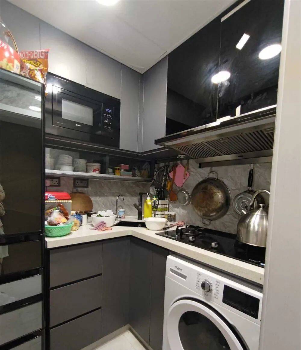 夹角的水槽倒是节省了一定的空间,空出了一处台面空间;且洗衣机、冰箱都嵌入了橱柜中,倒是干净利落。