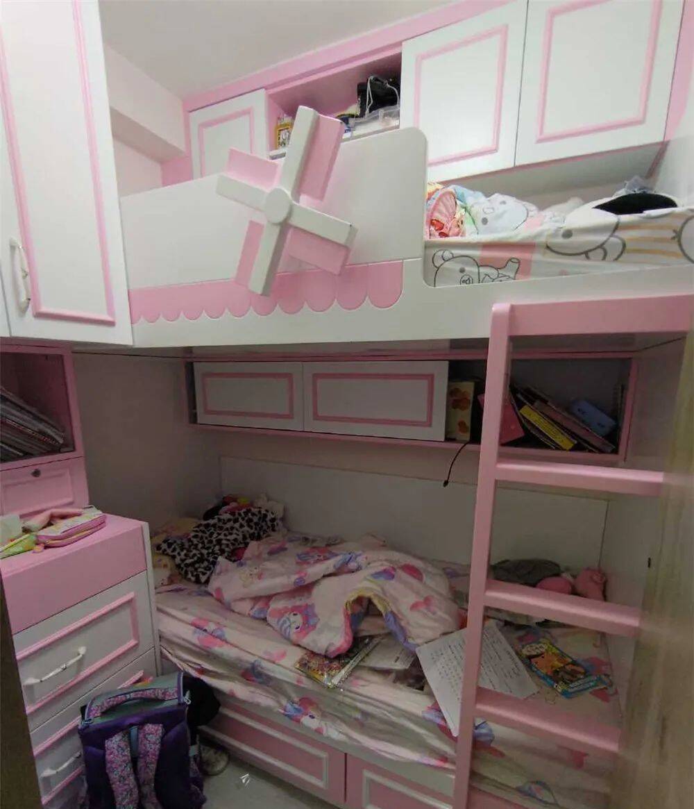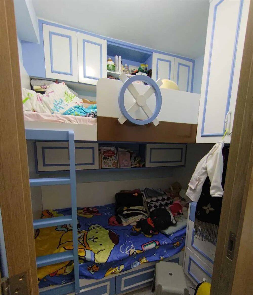 而电视柜左手边这间,格局也相差无几,差不多是“镜像”的房间,也是上下铺+柜子的设计,将纵向空间充分利用了起来。