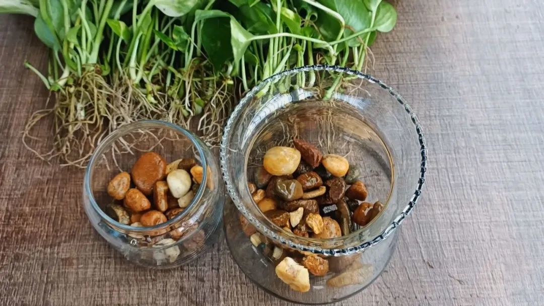 后期可以继续水培,准备一些大一点的玻璃容器,比如金鱼缸,在容器的底部铺上一层鹅卵石,主要是为了美观,也是为了让这些绿萝的根系散开,也会让黄金葛的根系长得更加健壮。
