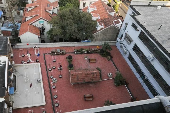 如今,武康大楼居民的自治已经形成了不少样板工程:解放前资本家的车库平顶,曾经一度是铺设沥青的废弃空间,现在被居民们自发改造成了一个种满花草、可以晾衣的公共休憩平台。每天落日西斜时分,武康大楼的居民们就三三两两上去散步聊天、赏景放空,在风景宜人的“空中花园”里怡然自得。