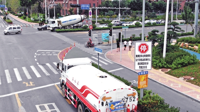 目前,交警部门已经在世纪大道等8个路口18个方向设置了大货车右转停车让行禁令标志和右转停车让行区,并安装了大货车“右转必停”让行违法采集专用电警设备。据介绍,自10月初试行大货车“右转必停”规定以来,已有80%左右大货车进行右转停车让行,未发生因右转盲区造成的交通事故。