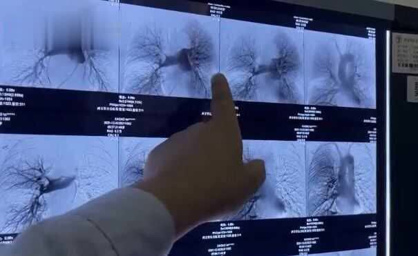 西安市红会医院周围血管科(介入科)主任袁会军说:“筛查检测以后高度怀疑他是急性肺栓塞,所以我们就马上启动了绿色通道,最终证实这个人是一个肺动脉主干的骑跨栓。患者右肺的中叶,左肺的舌叶,整个都不染色,你看正常肺都是这种,就是主干的血栓,属于重型的肺栓塞。 ”
