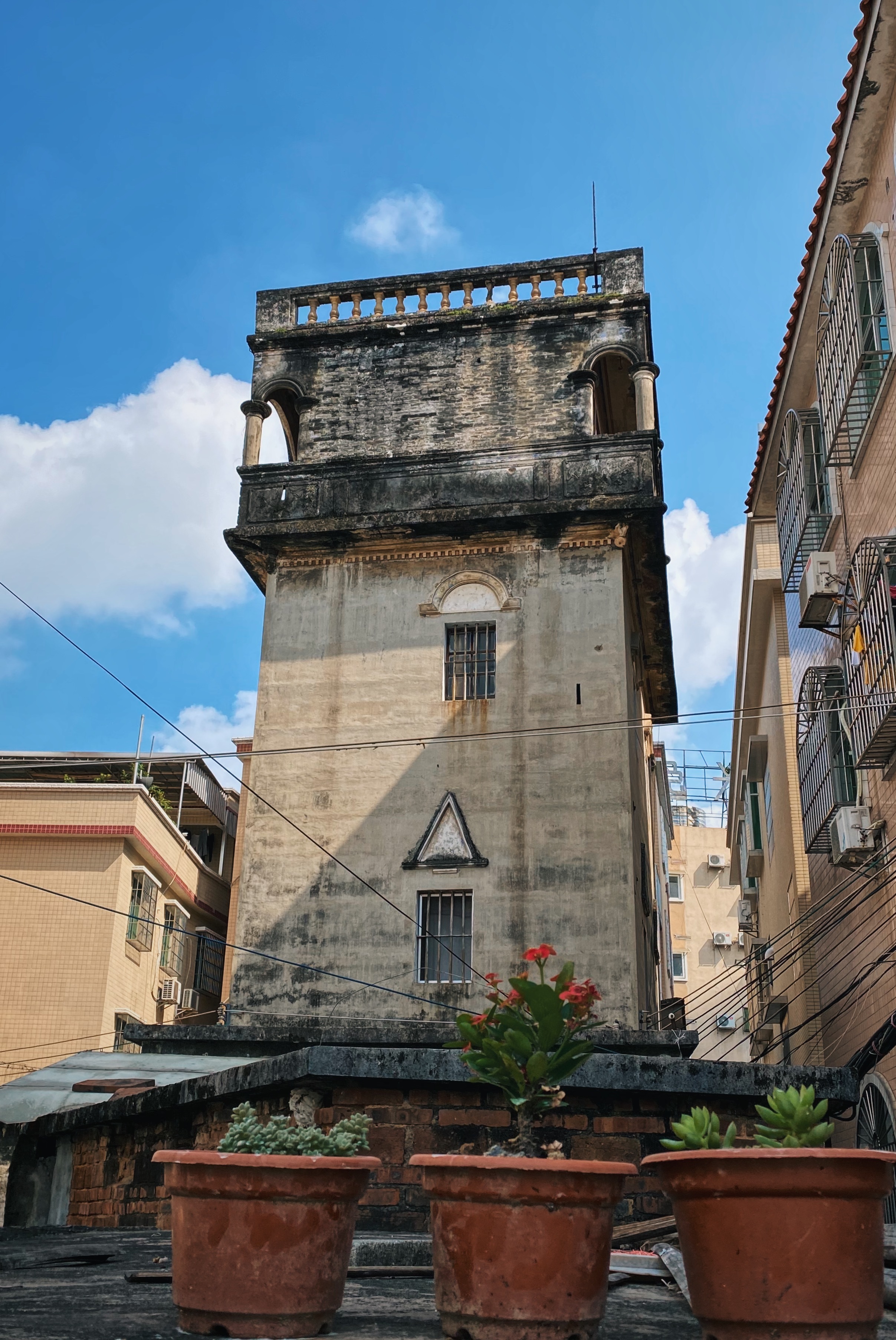 中山的碉楼在曹边村、沙边村、库充村分布比较集中,如果要去的话比较推荐结合美食打卡,先在附近找个好吃的顺便再到村落里逛一逛。然后市区也有蛮多碉楼,但比较分散,很多都藏在小巷子里,如果不是做研究的话就不推荐单独去看了,倒是可以多在老街巷里走走,说不定就会遇见。比如下图左侧是我在市区偶遇的一座碉楼,由于样式比较简单,在发现之前我经常路过都没有注意到。