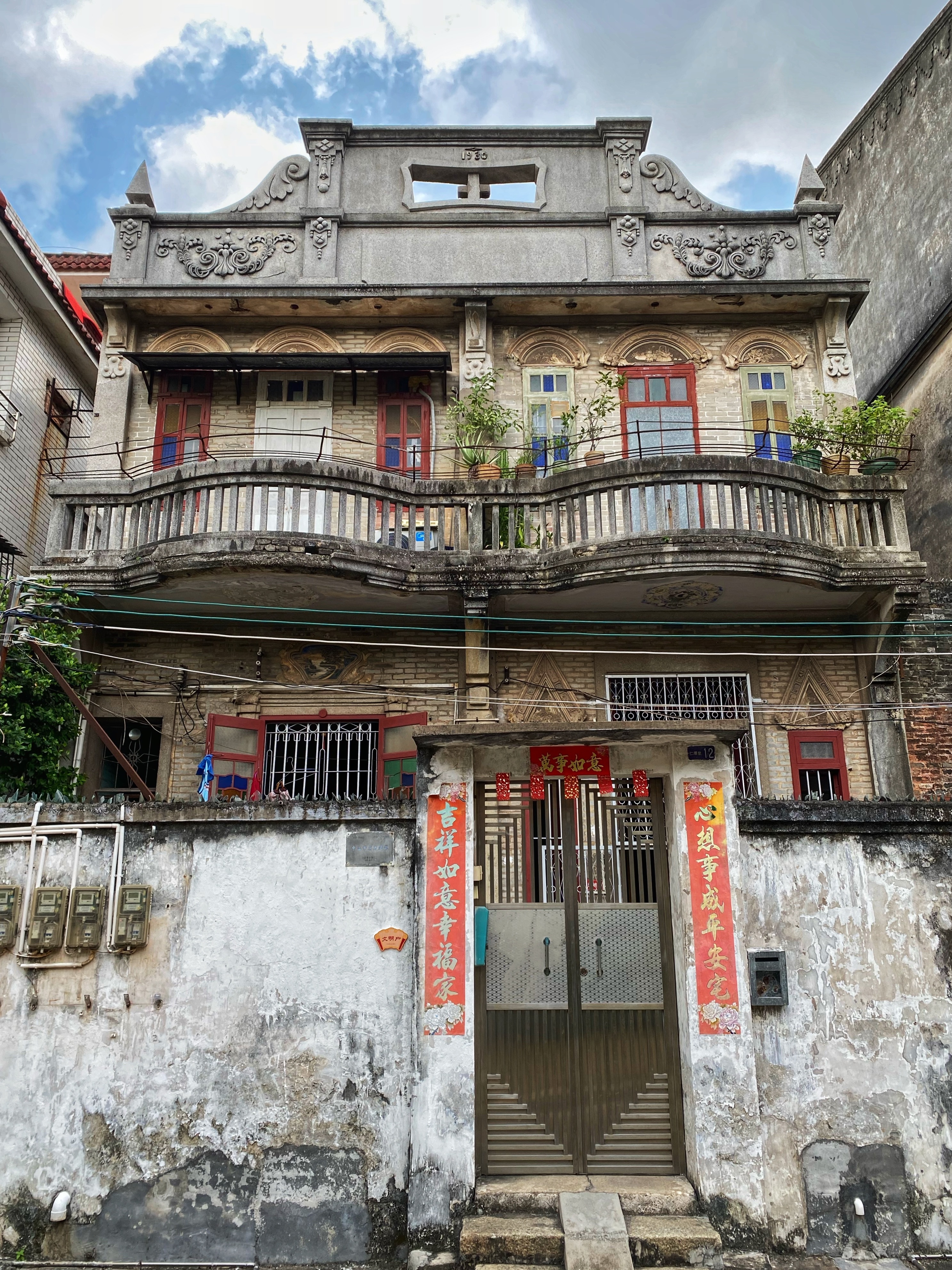中山的碉楼蛮多都是下面这种比较简单的样式,开平那种比较华丽的碉楼就并不多。简单的碉楼仔细看的话也能找到蛮多细节,比如窗户上的窗楣,为了避免图案重复,选择了两种样式;顶部的平台四个角都做了欧式风格的立柱,下沿还绘制了中国传统主题的书画。这些都能让我们看到当时的西方建筑文化和中国传统文化的有机结合。