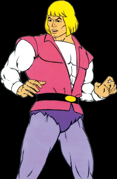 变身前的亚当王子同样是一个在形象上非常特立独行的人:身穿粉色紧身衬衫、淡紫色的紧身衣和紫色的靴子,留着金色的BOB发型。
