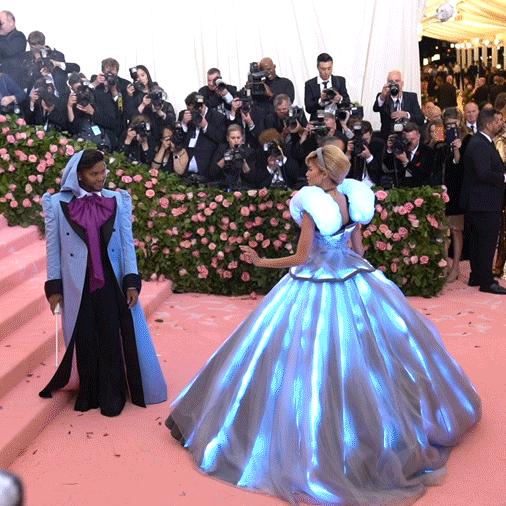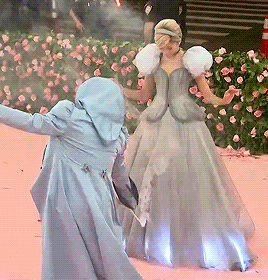 最特别的是,还有一直陪伴着她的造型师Law Roach在旁边扮作仙女教母,“施展魔法”,点亮灰姑娘的长裙。