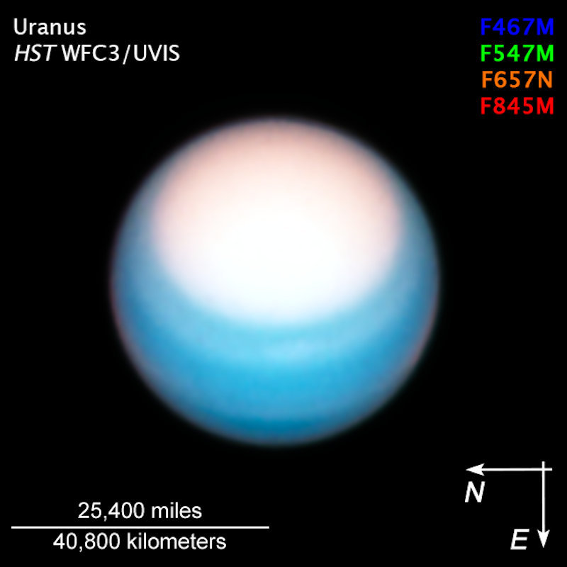 天王星在哈勃望远镜中显示出明亮的极冠,摄于2021年10月25日。图片来源: NASA/ ESA/ Amy Simon (NASA-GSFC)/ Michael H. Wong (UC Berkeley)/ Alyssa Pagan (STScI)/ Hubblesite.