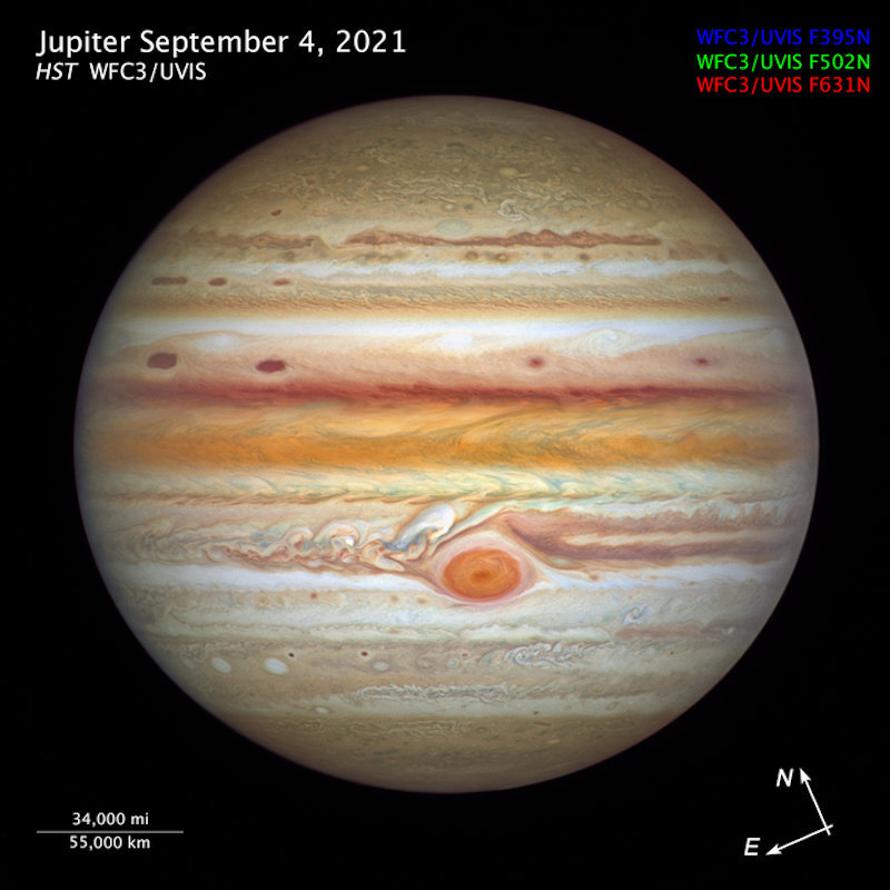 哈勃望远镜观测到的木星及其如风暴般的大气层,摄于2021年9月4日。图片来源:Amy Simon (NASA-GSFC)/ Michael H. Wong (UC Berkeley)/ Hubblesite.