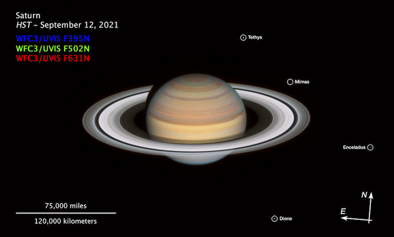 2021年9月12日,哈勃望远镜观到的土星及其光环。图片来源:ESA/ NASA/ Amy Simon (NASA-GSFC)/ Michael H. Wong (UC Berkeley)/ Alyssa Pagan (STScI)/ Hubblesite.