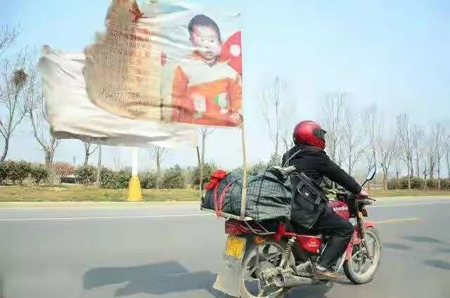 郭刚堂的摩托车上还插着一面彩旗,上面印着郭振小时候的照片,在这20多年的时间里,失去孩子的郭刚堂一直秉承着一个信念:“只有在路上,我才感觉自己是个父亲。”