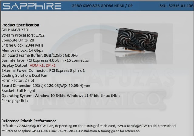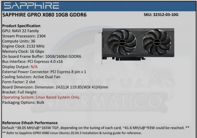 据外媒El Chapuzas Informatico消息,蓝宝石的两个专门针对加密货币的显卡信息,分别为蓝宝石 GPRO X080和蓝宝石 GPRO X060,在泄露的参数表中,这两款显卡还标注了哈希算力值。