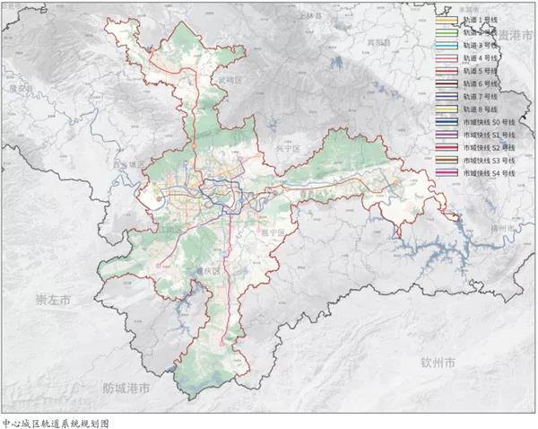 4. S1机场线的调整。S1线在一期的基础上,将绕过青秀山南侧,改走青环路,向北延至嘉和城附近。