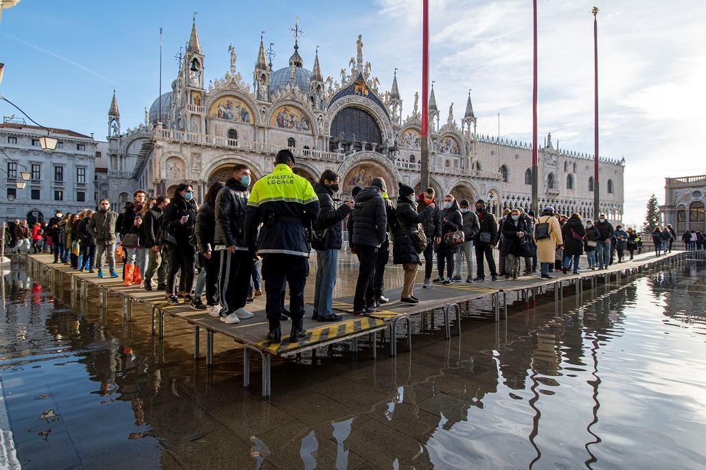 当地时间12月4日,意大利威尼斯城内的水位达到了海平面以上99厘米,城镇部分地区被海潮淹没,圣马可广场架起栈桥以便游客通行。威尼斯的水患通常发生在冬季,持续降雨和劲风会抬高亚得里亚海水位,将海水灌入“水城”。