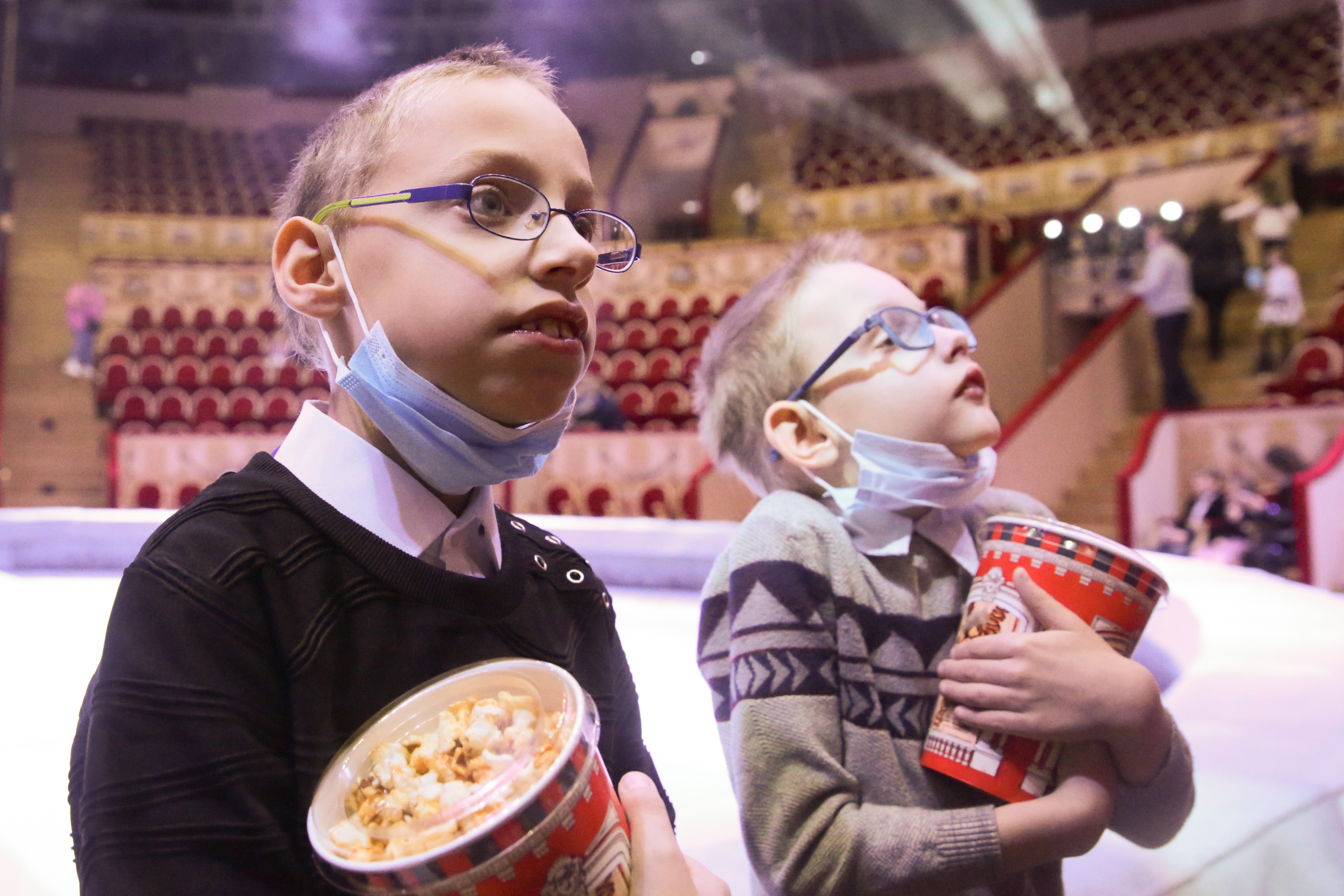 12月3日,小朋友在俄罗斯圣彼得堡国立大马戏院手捧爆米花等待观看马戏表演。新华社发(莫京娜 摄)
