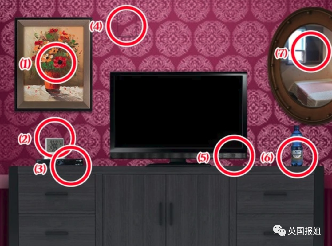 这是一间看似平常的客厅模拟图,却有7种针孔摄像头(每个都是真实案件中的作案工具)。