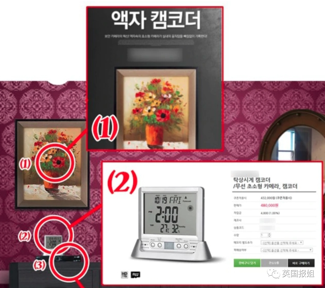 夹在画的暗处的摄像头、伪装成电子钟、影碟机的摄像头。