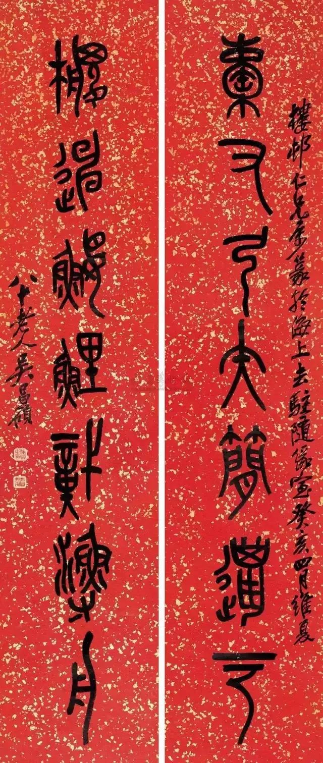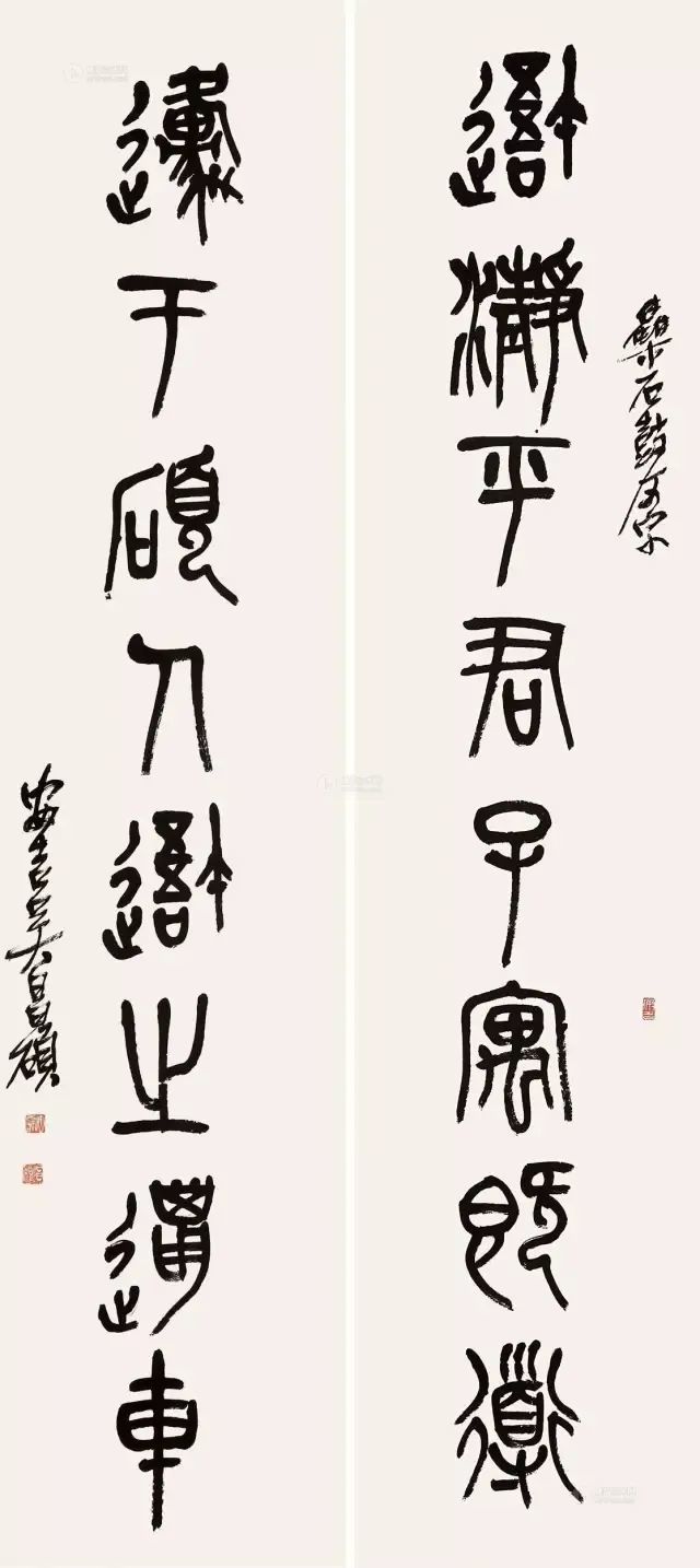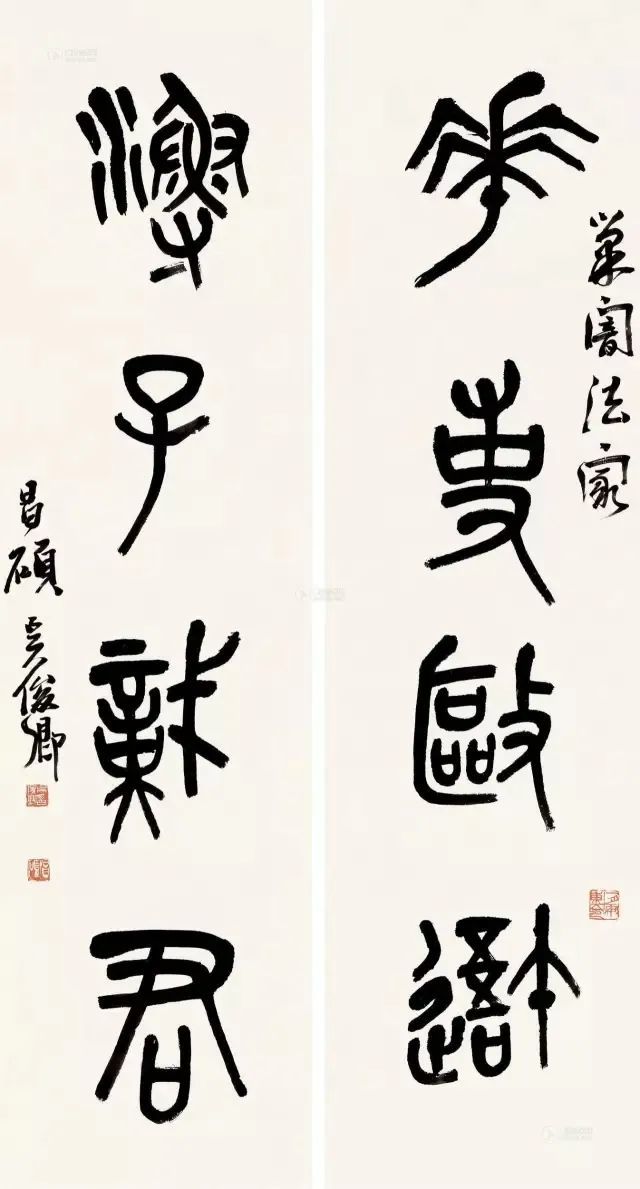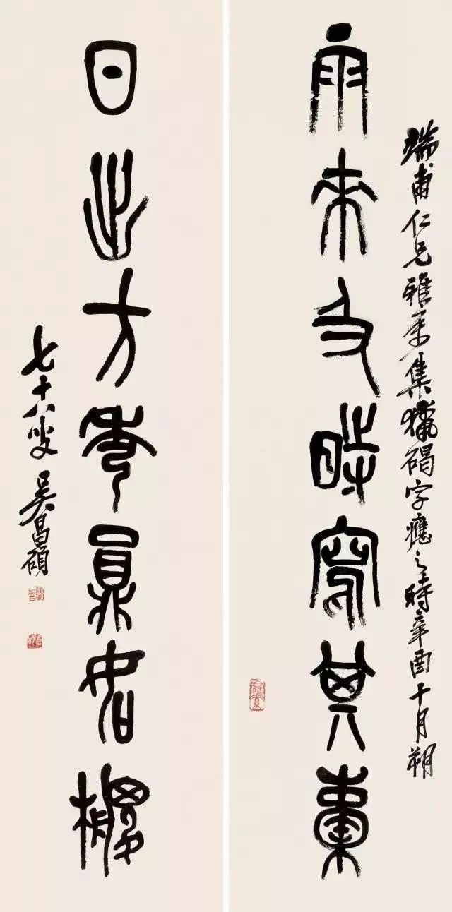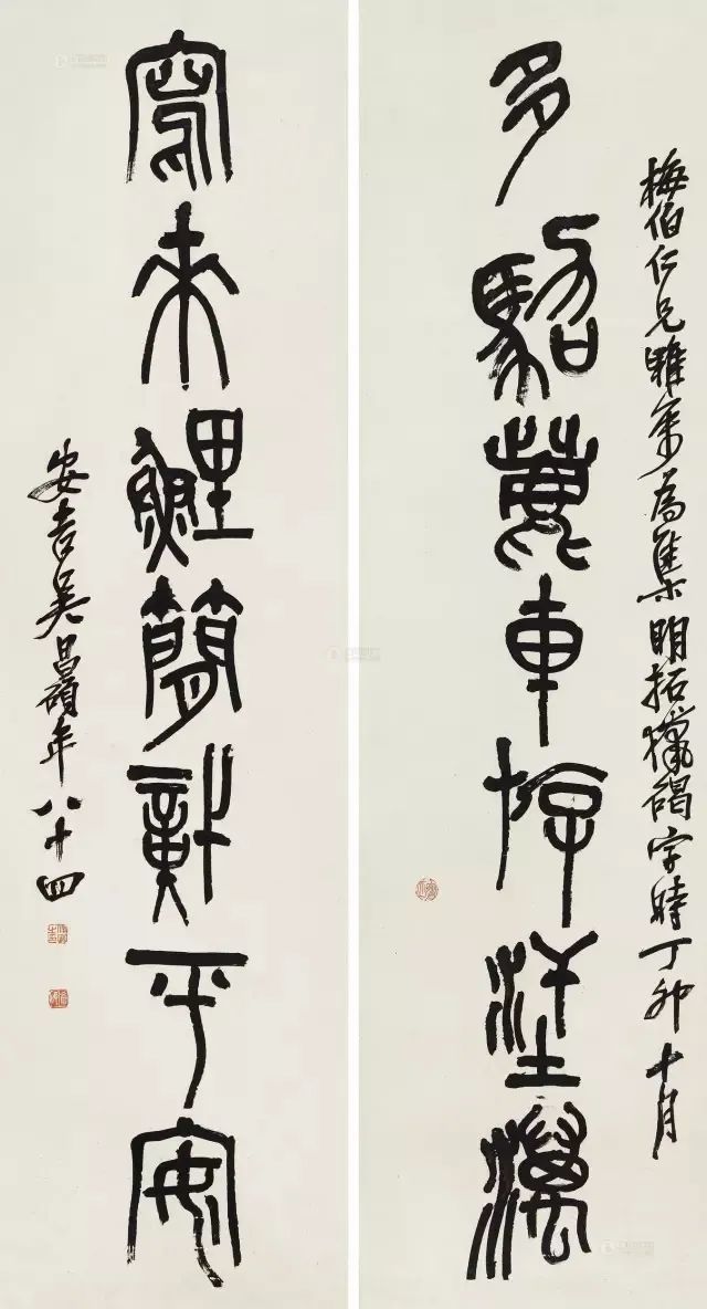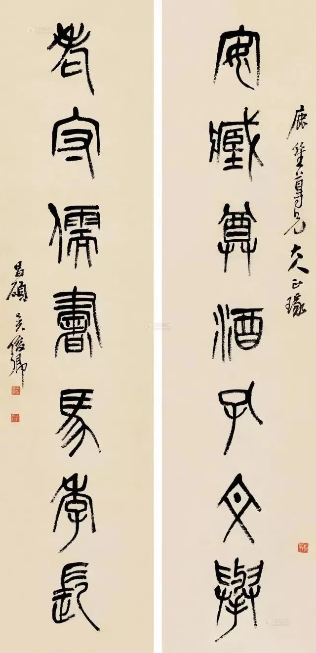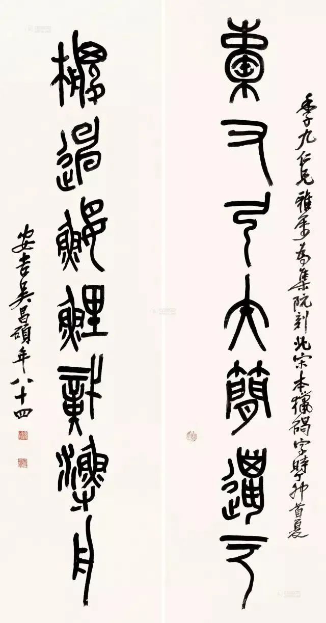 吴昌硕的书法以篆书、行草为主,但以篆书成就最高。他30多岁时就开始临习《石鼓文》,此后竟终身不辍。他的成就在于将《石鼓文》写出自己的独特面貌,浑厚华滋,苍茫雄强,成为篆书的一个新境界。自出新意,风格独特。60岁后所书尤精,圆熟精悍,刚柔并济。喜将石鼓文字集语书写对联。晚年以篆隶笔法作草书,笔势奔腾,苍劲雄浑,不拘成法。《西泠印社记》是吴昌硕71岁时为纪念西泠印社成立而书写的碑文,辞章与书法俱佳,是吴昌硕人书俱老时期小篆艺术风范的杰作。