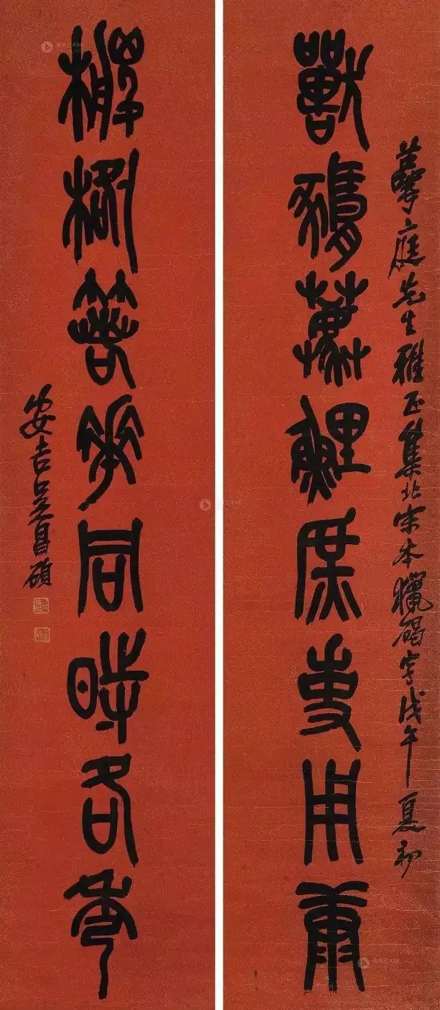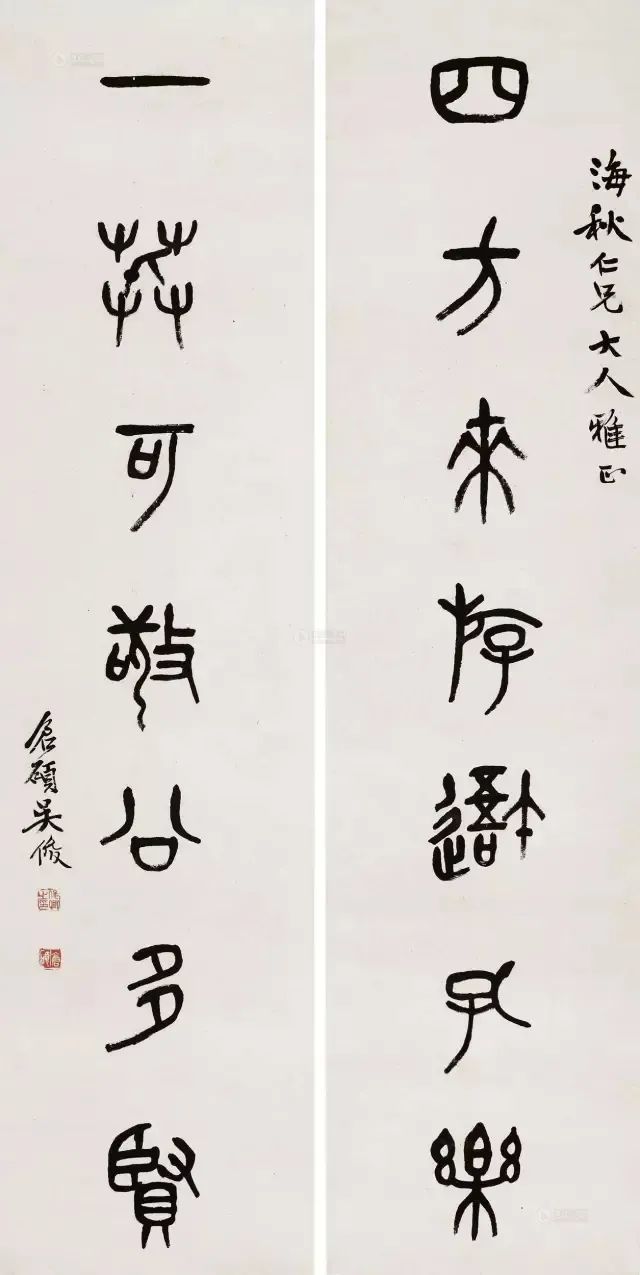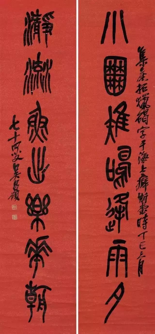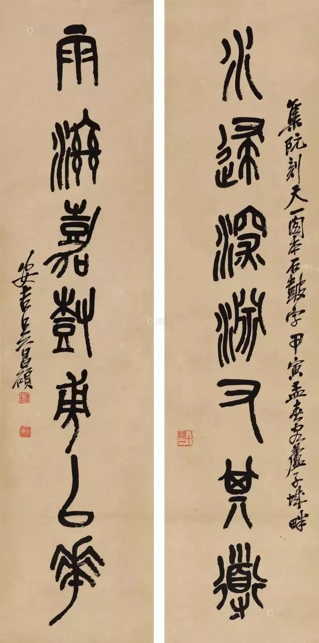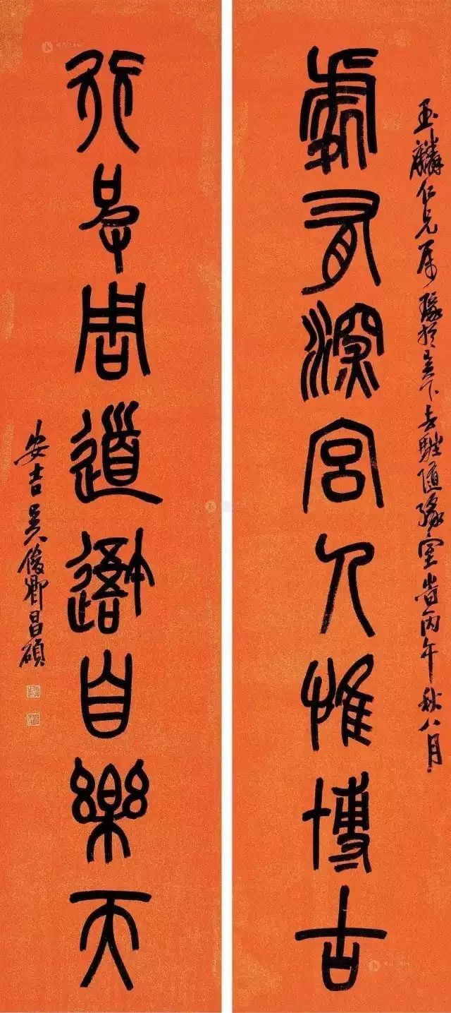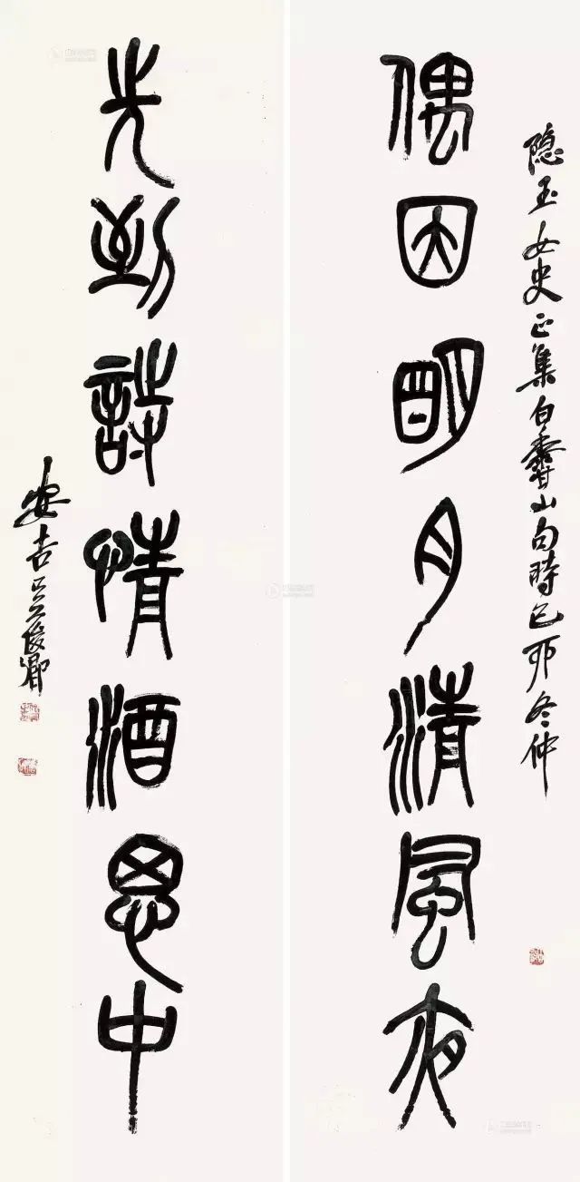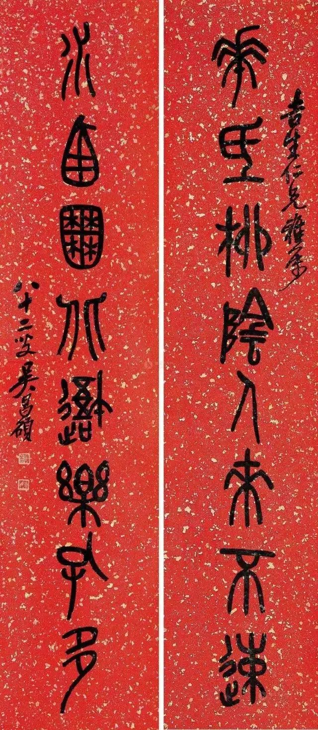 吴昌硕的书法以篆书、行草为主,但以篆书成就最高。他30多岁时就开始临习《石鼓文》,此后竟终身不辍。他的成就在于将《石鼓文》写出自己的独特面貌,浑厚华滋,苍茫雄强,成为篆书的一个新境界。自出新意,风格独特。60岁后所书尤精,圆熟精悍,刚柔并济。喜将石鼓文字集语书写对联。晚年以篆隶笔法作草书,笔势奔腾,苍劲雄浑,不拘成法。《西泠印社记》是吴昌硕71岁时为纪念西泠印社成立而书写的碑文,辞章与书法俱佳,是吴昌硕人书俱老时期小篆艺术风范的杰作。