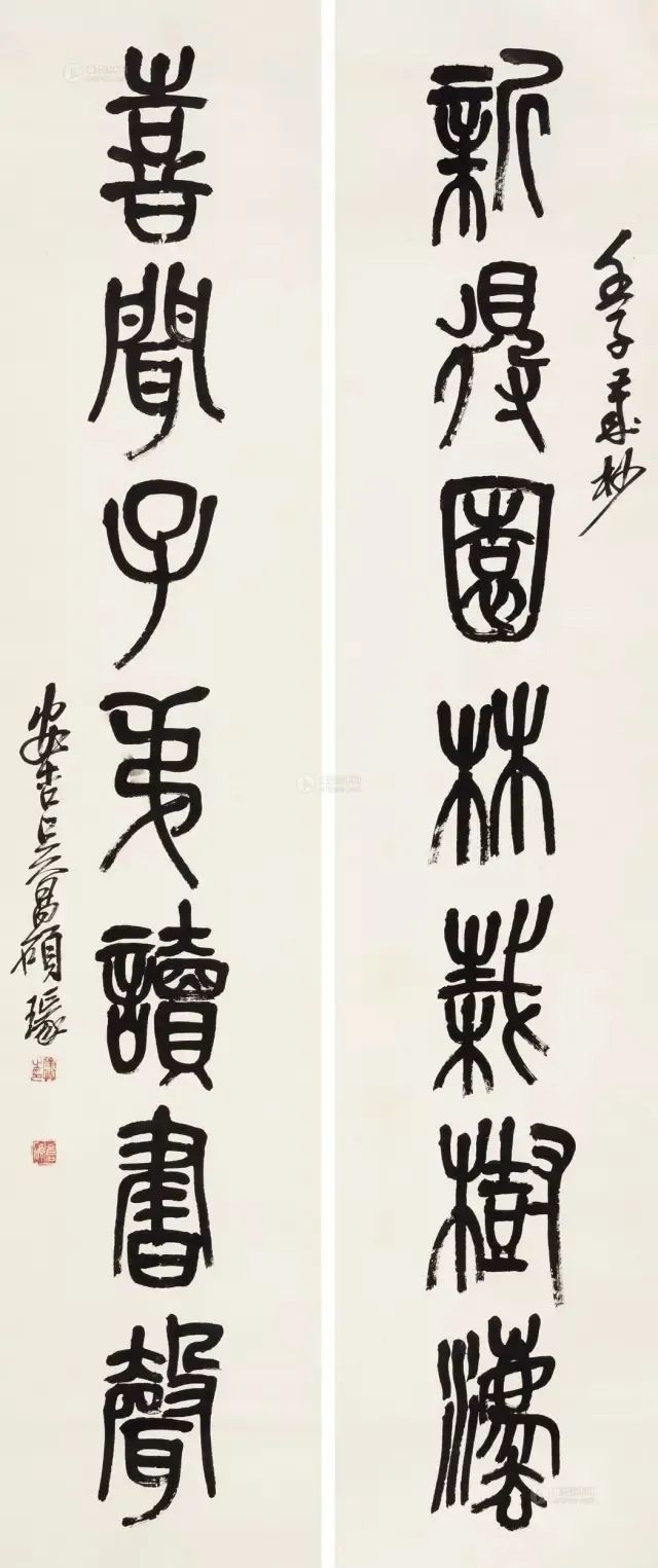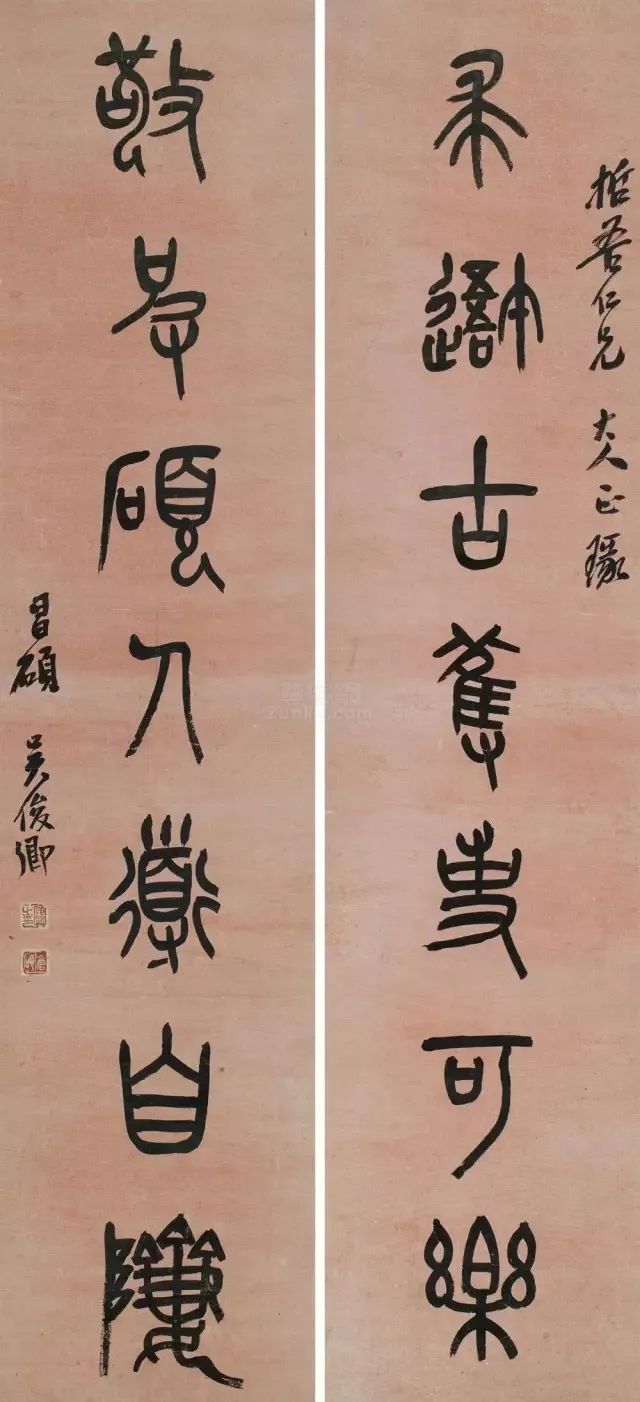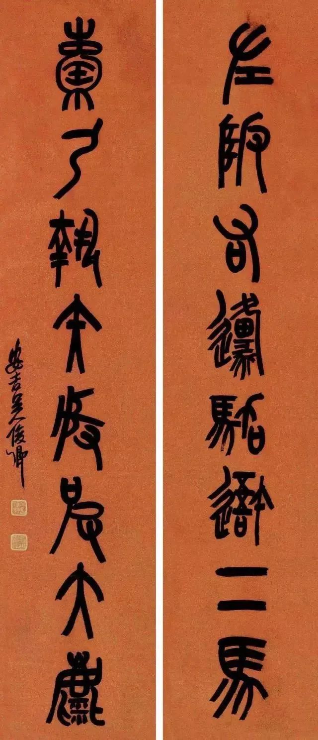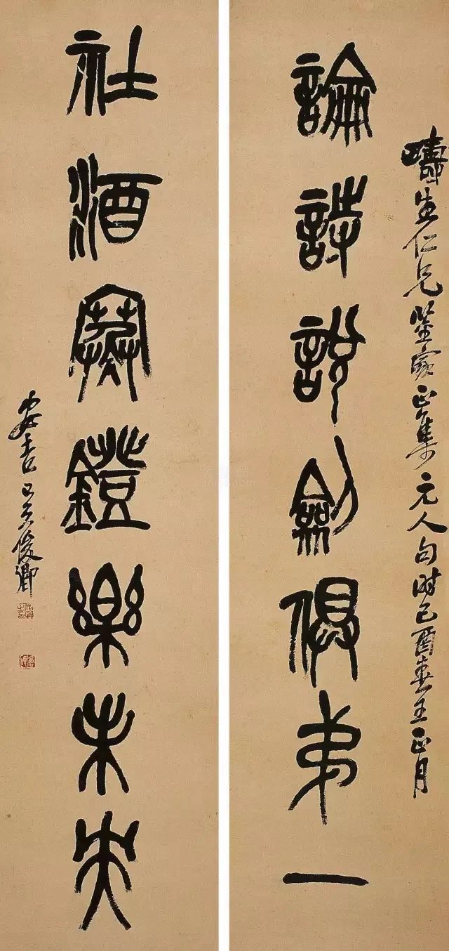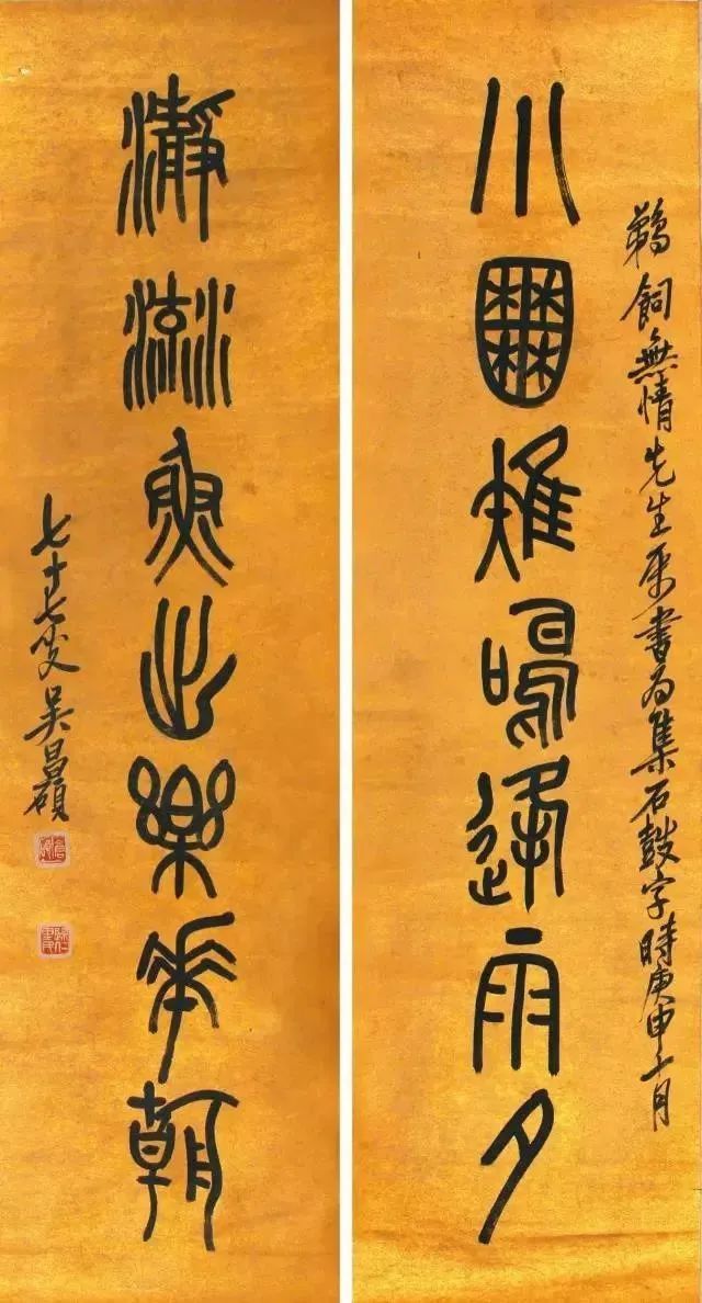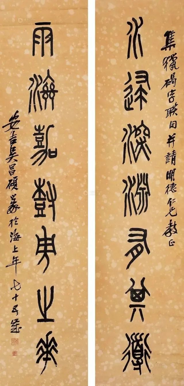 吴昌硕的书法以篆书、行草为主,但以篆书成就最高。他30多岁时就开始临习《石鼓文》,此后竟终身不辍。他的成就在于将《石鼓文》写出自己的独特面貌,浑厚华滋,苍茫雄强,成为篆书的一个新境界。自出新意,风格独特。60岁后所书尤精,圆熟精悍,刚柔并济。喜将石鼓文字集语书写对联。晚年以篆隶笔法作草书,笔势奔腾,苍劲雄浑,不拘成法。《西泠印社记》是吴昌硕71岁时为纪念西泠印社成立而书写的碑文,辞章与书法俱佳,是吴昌硕人书俱老时期小篆艺术风范的杰作。