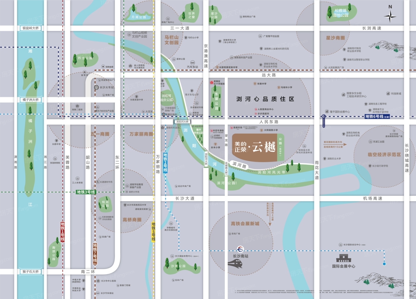 从项目出发,往东途经人民东路和五一大道,自驾12.4km,可达五一商圈;往西走机场高速,行驶17.1km,抵达黄花机场;往南经过滨河路和雨花大道,直达长沙南站,仅有4.7km路程。