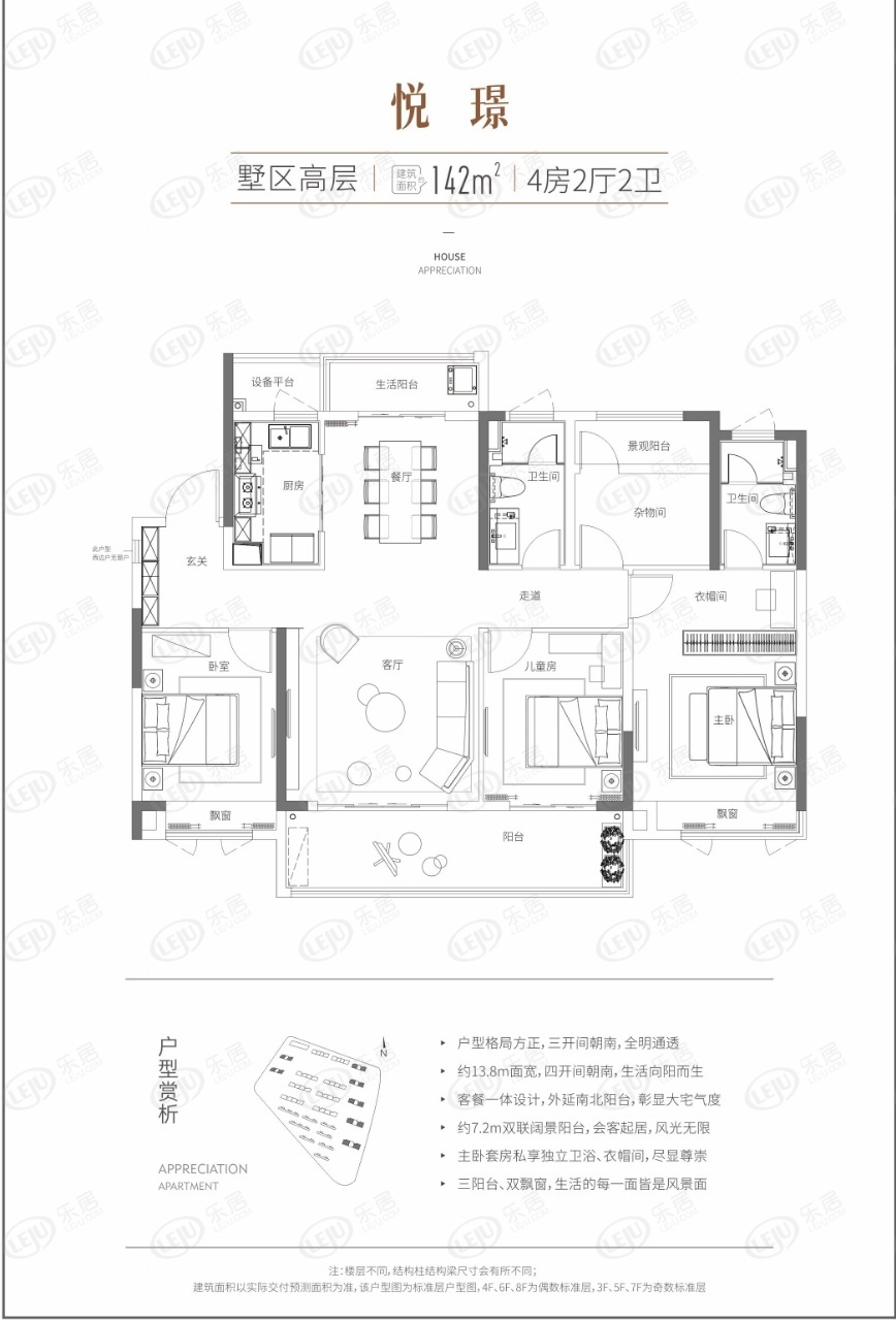 该户型建面约143m²,4房2厅2卫格局,户型周正,南北通透,动静分区。